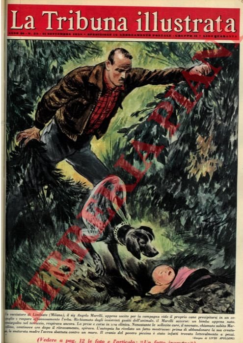Un cacciatore di Limbiate (Milano) , il sig. Angelo Marelli, appena uscito per la campagna vide il proprio cane precipitarsi in un cespuglio e raspare affannosamente l'erba. Richiamato dagli insistenti guaiti dell'animale, il Marelli accorse: un bimbo appena nato, semisepolto nel terriccio, respirava ancora. .