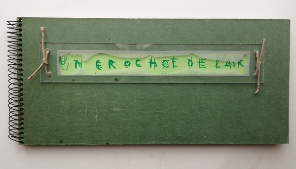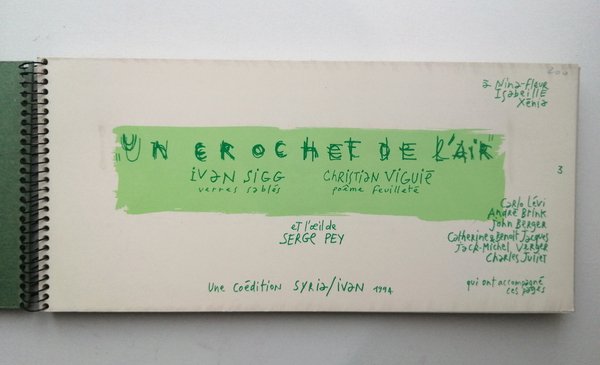 LIBRO D ARTISTA formato 13X28. Copertina in cartone fustellato con un inserto di una lastra in perspex sabbiato e legato con una cordicella, opera originale di Ivan Sigg. Una spirale lega le 48 pagine con un testo serigrafato in verde di Christian Viguie e 11 riproduzioni dei perspex sabbiate di Siegg. Tiratura limitata in 1000 esemplari. Bella copia
