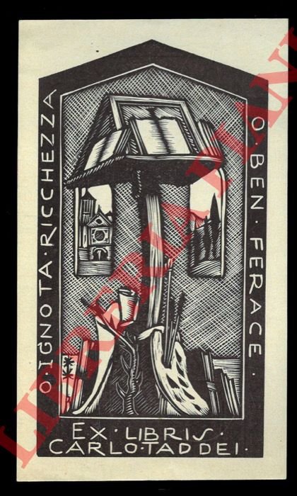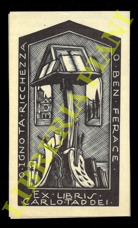 Un foglietto xilografico di cm 12,4 x 7 in marron/nero, per CarloTaddei : "O ignota ricchezza o ben ferace"