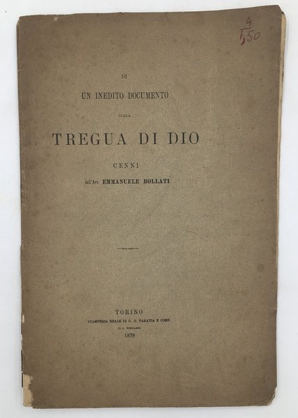 In-8° (cm. 24,5), pp. 20. Brossura editoriale, piatti staccati, ma interno ottimo in carta di pregio. DEDICA AUTOGRAFA dell'Autore parzialmente abrasa. Emanuele Federico BOLLATI di Saint-Pierre, Direttore dell'Archivio di Stato di Torino, Socio nazionale residente dal 30/06/1878. Censito in sole 2 bibl. it.