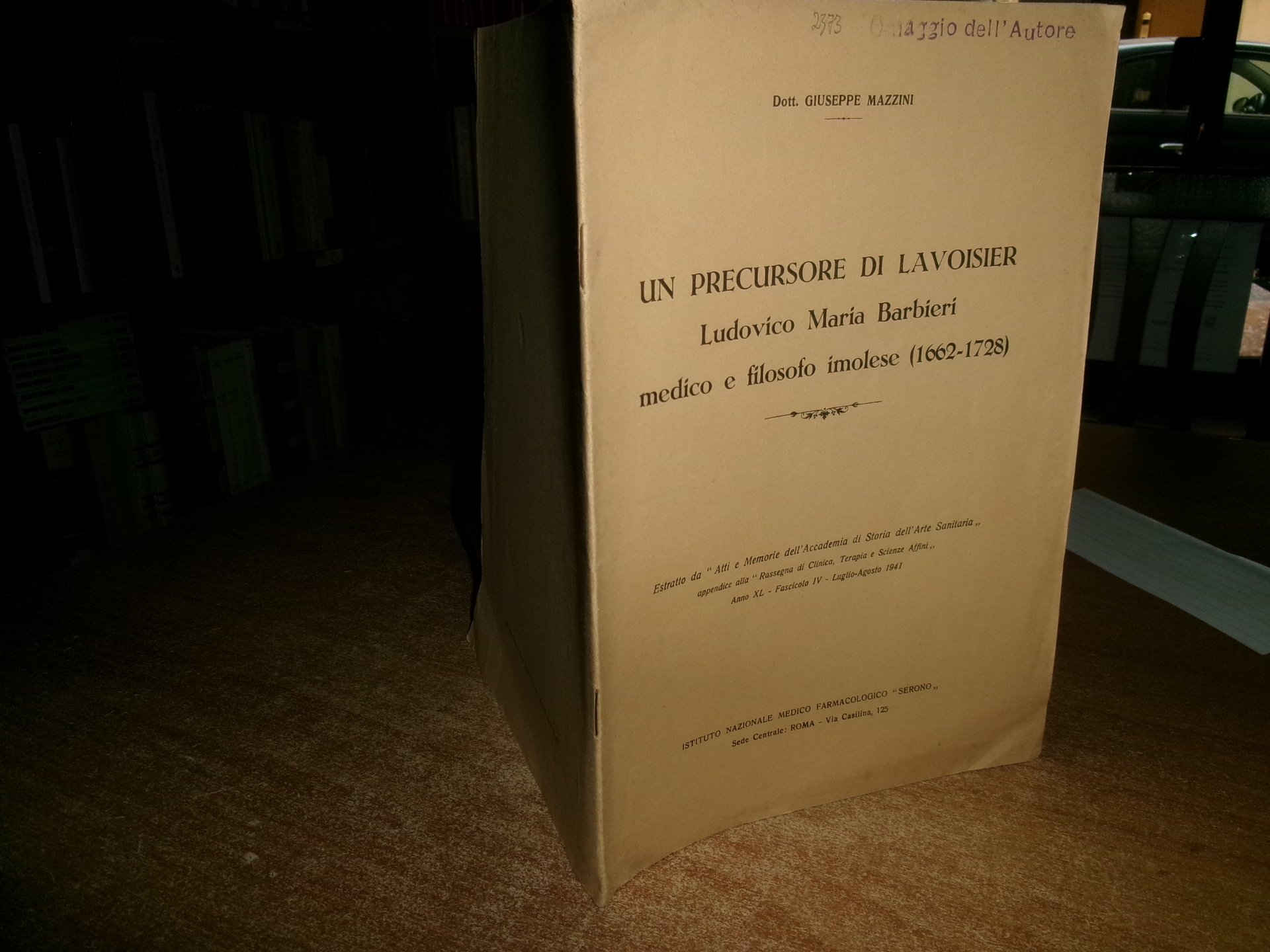 Giuseppe Mazzini. Roma, Ist. Naz. Medico Farmacologico "Serono", 1941. Un Precursore di LAVOISIER Ludovico Maria Barbieri Medico e Filosofo Imolese (1662-1728). In-8°, br. con punti metallici. 16 pp. con alcune illustrazioni n.t. Opuscolo ben conservato. Neg. mob. rosso entro busta trasp.