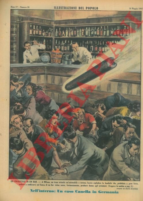 Un proiettile in un bar. A Milano, un tram urtando un'automobile a metano faceva esplodere la bombola che, proiettata a gran forza, andava a conficcarsi nel banco di un bar vicino, senza, fortunatamente, produrre danno agli avventori.