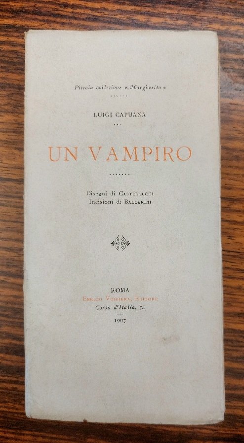 >in-24, pp. 130, (6), 5 tavole f.t; broch. edit. figurata al piatto post (porzione inferiore del dorso rinforzata). Graziosa edizione di due novelle, "Un vampiro" e "Fatale influsso", che l'autore dedicò a Cesare Lombroso. Ottimo esemplare, a pieni margini.