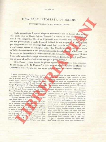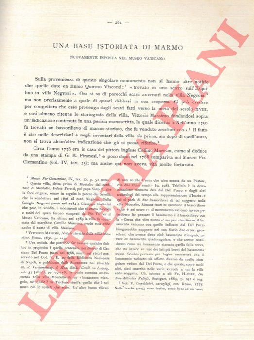 Roma, 1908, 8vo stralcio con copertina posticcia muta, pp. 261/278 con 7 illustrazioni. - ! ATTENZIONE !: Con il termine estratto (o stralcio) intendiamo riferirci ad un fascicolo contenente un articolo, completo in se, sia che esso sia stato stampato a parte utilizzando la stessa composizione sia che provenga direttamente da una rivista. Le pagine sono indicate come "da/a", ad esempio: 229/231 significa che il testo è composto da tre pagine. Quando la rivista di provenienza non viene indicata é perché ci è sconosciuta. - ! ATTENTION !: : NOT A BOOK : “extract” or “excerpt” means simply a few pages, original nonetheless, printed in a magazine. Pages are indicated as in "from” “to", for example: 229/231 means the text comprises three pages (229, 230 and 231). If the magazine that contained the pages is not mentioned, it is because it is unknown to us.