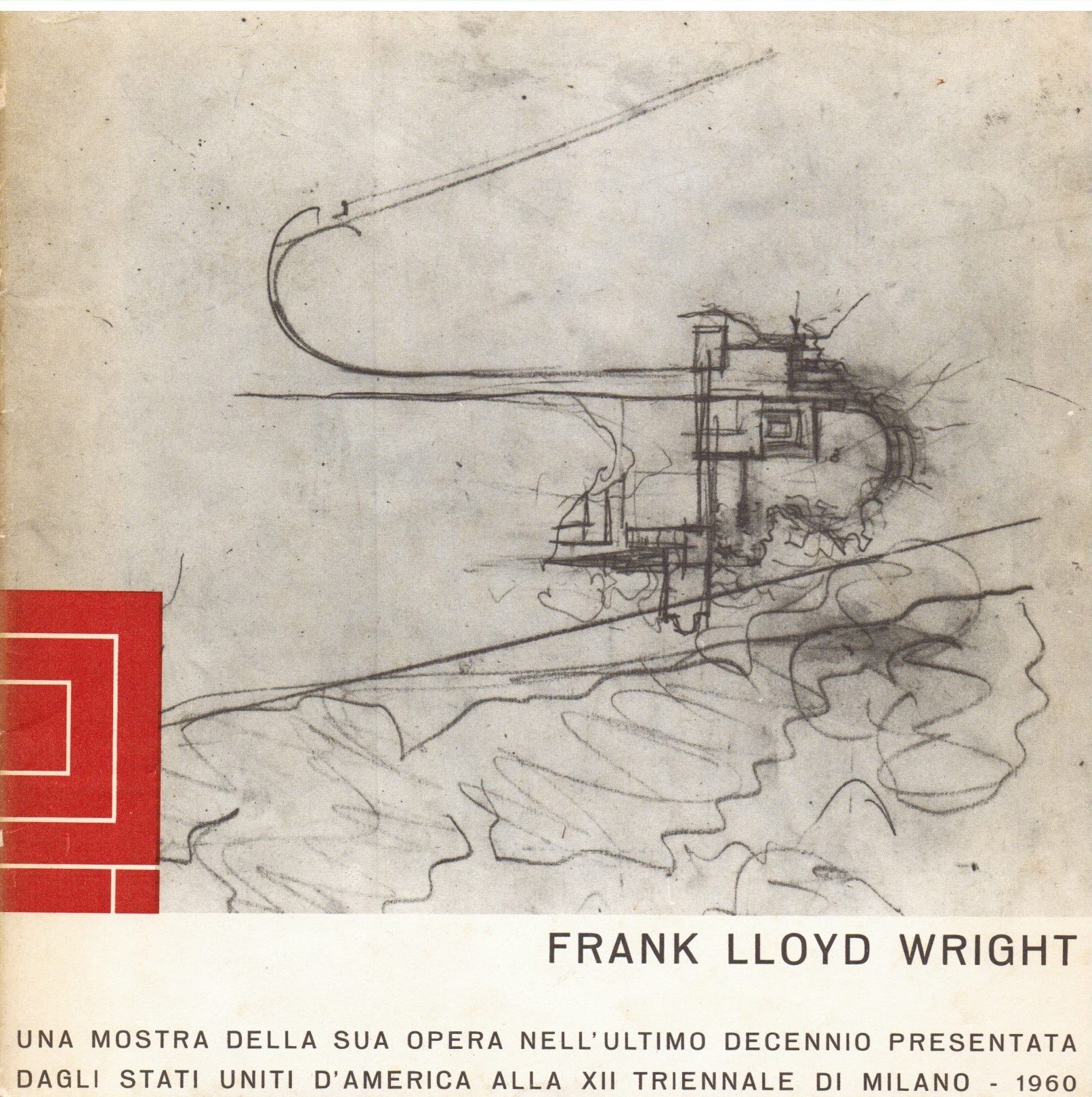 In-8° moderno quadrato (cm 21x21) in brossura editoriale con piatti e contropiatti figurati e con paratesti. Pp 18 non numerate con contributi testuali e didascalie di F. L. Wright in calce alle belle riproduzioni fotografiche in b/n anche a piena pagina delle sue opere, contributi testuali dei curatori delle mostra sul periodo di produzione 1950-60 nonché sulle parti componenti la mostra dell'architetto alla Triennale di Milano. Lievi segni del tempo e d'uso ai piatti, interno fresco: più che buona copia.
