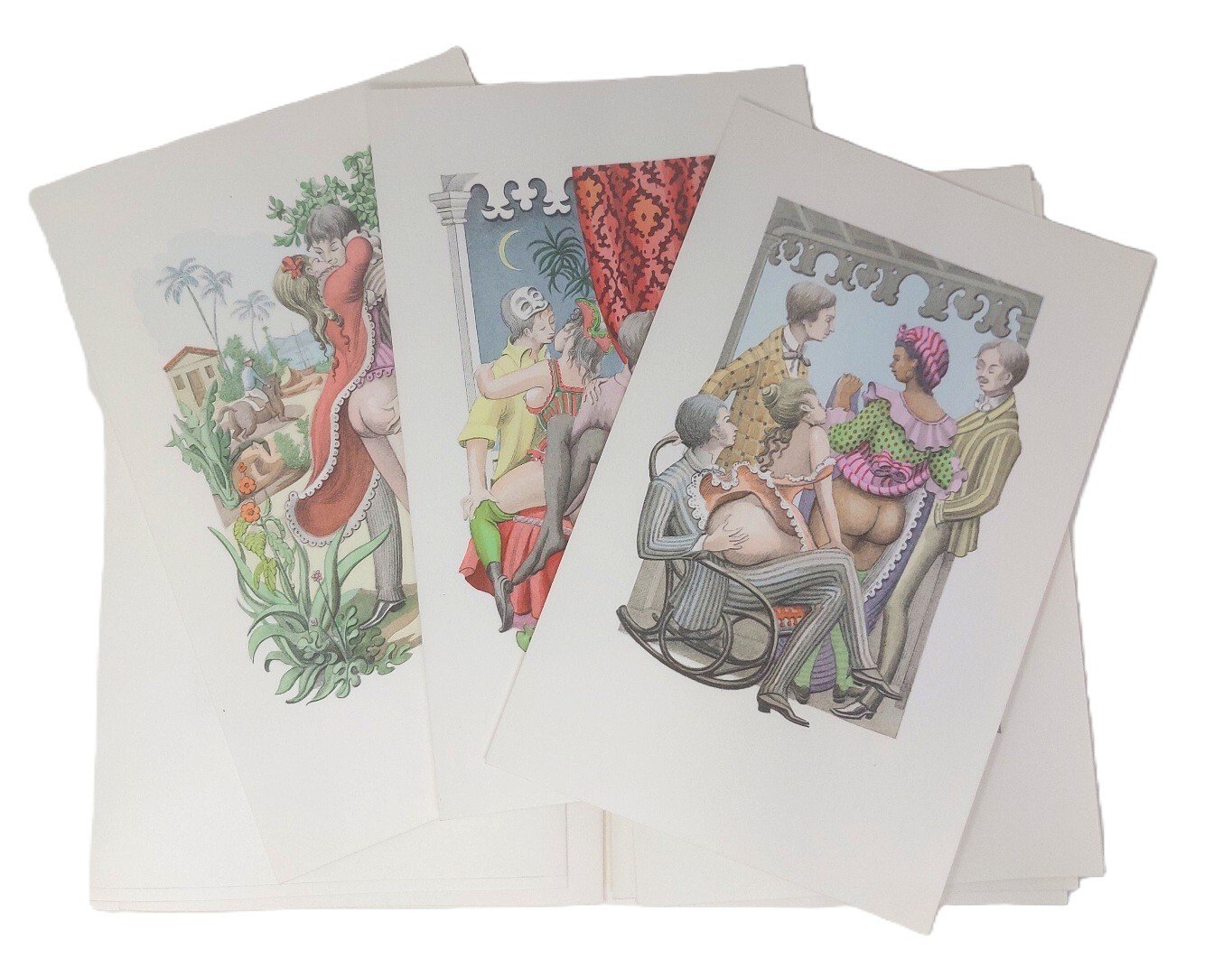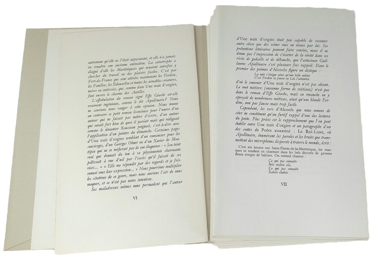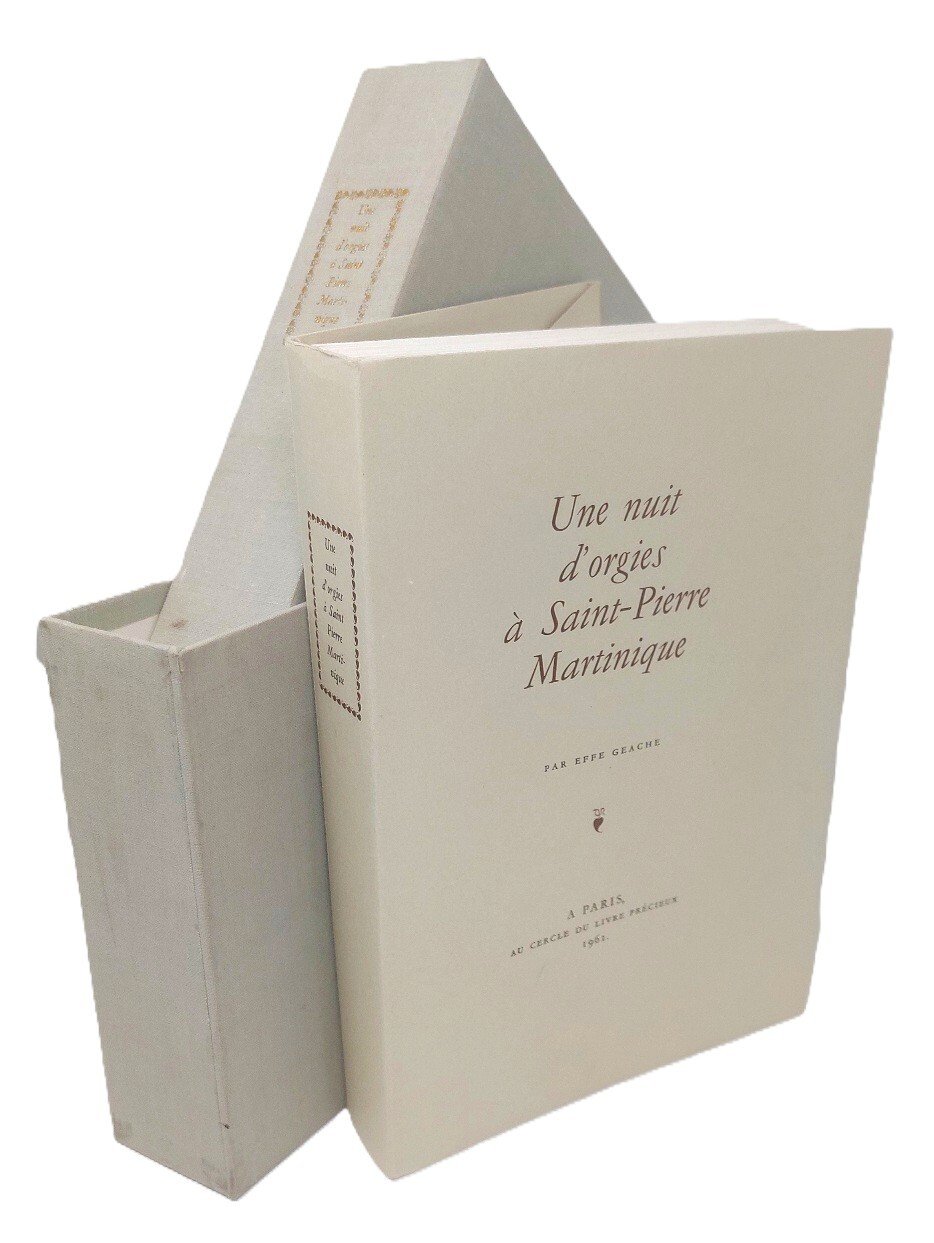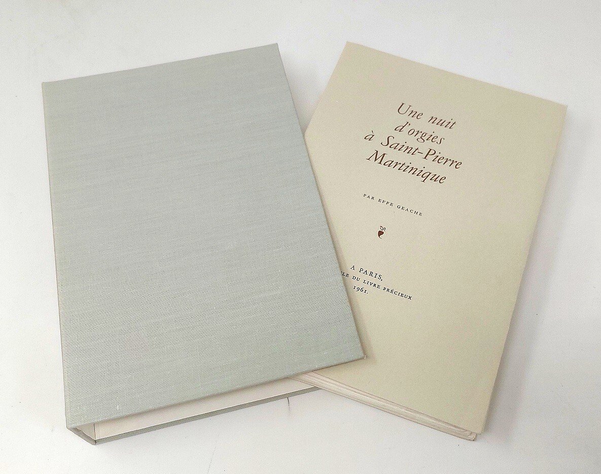 >in-8 grande (245x170 mm), pp. IX, 9, 139, in fogli sciolti, 12 incisioni erotiche a colori f.t. di Michel Simeon. Cofanetto e astuccio in tela edit. Edizione a tiratura limitata di 750 esemplari numerati (ns. 47). Une nuit d'orgie à Saint-Pierre Martinique fu pubblicato nel 1893 da ignoto autore a firma Effe Géache o F.G.H.. La storia di questo romanzo erotico si svolge nella "Parigi delle Antille", ancora chiamata la "Venezia tropicale" o la "Sodoma americana", che era allora Saint-Pierre, la capitale dell'isola di Martinica. Perfetto esemplare.