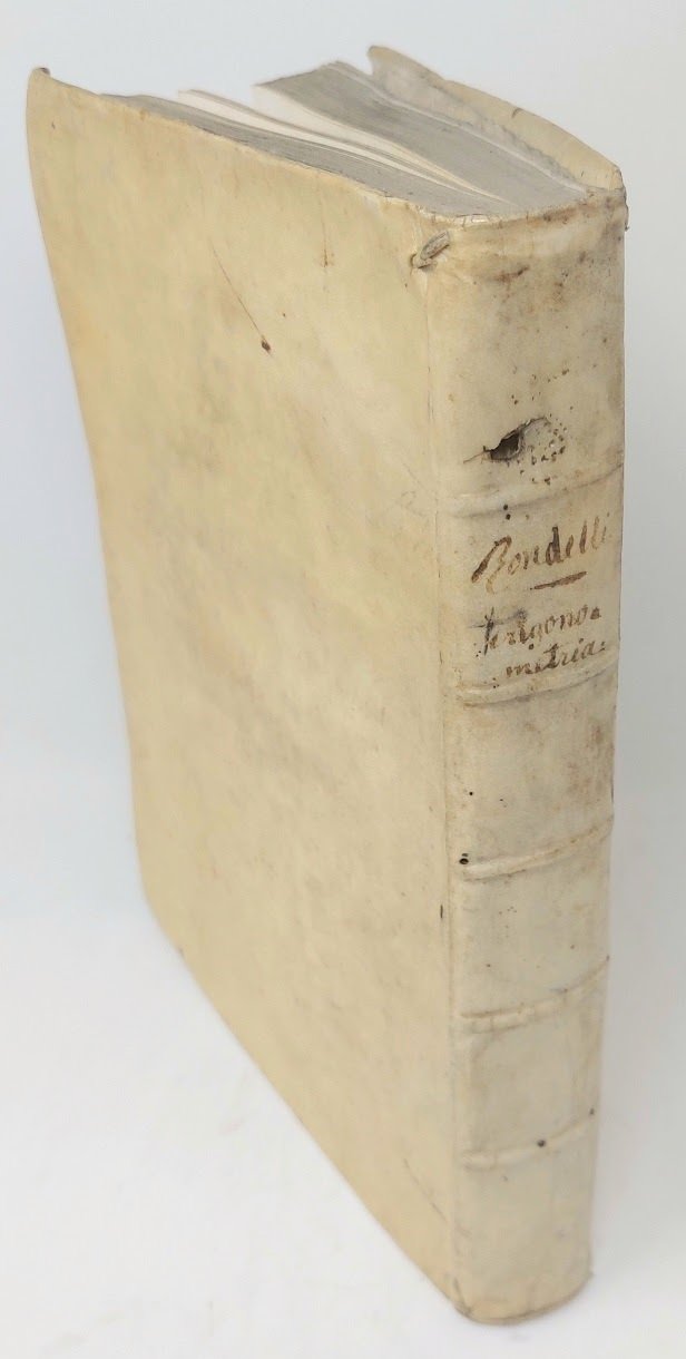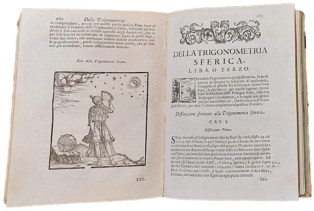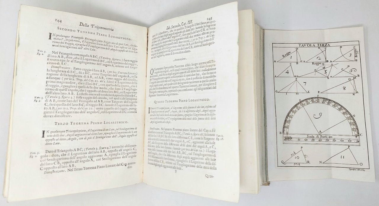 >in-4, pp. 272, leg. coeva p. perg., tit. ms. al dorso. Fregi ed iniz. xilogr. Con una bella fig. xilogr. a pag. 182 e 6 tavole inc. in rame da Canossa ripieg. f.t. in fine. Dedicato ad Annibale Albani, nipote di Clemente XI. Prima edizione di quest'opera del noto matematico, nato nel ducato di Modena (1652-1735), bibliotecario e poi insegnante di matematica, arte delle fortificazioni e di idraulica nell'Università di Bologna; diresse anche i lavori contro gli straripamenti del Po presso Ferrara. Per la purezza del linguaggio, l'opera viene registrata anche dal Gamba. Bell'esemplare. Riccardi I, 391. Gamba, Testi di Lingua, n.2070.-