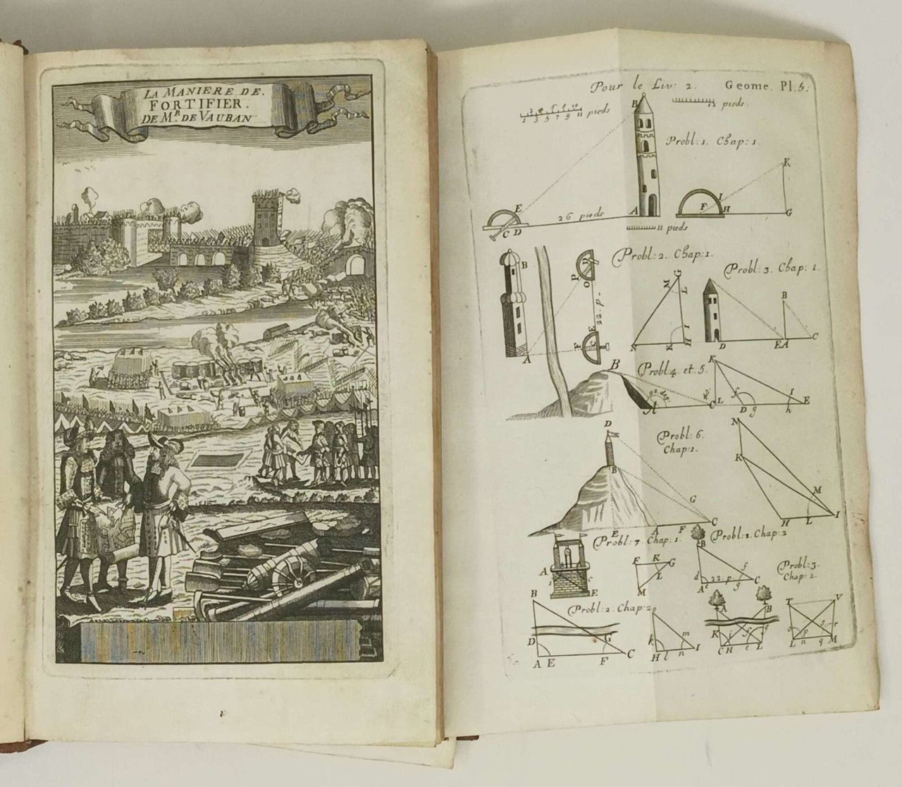 >2 tomi in un vol. in-8 (mm 200x125), pp. 88, (8); 167, (9). Leg. del tempo p. pelle, tit. e fregi oro al dorso. Antiporta figurato inciso, bellissimo, titoli a stampa rossa e nera con vignetta inc. I due tomi sono corredati di figure schematiche n.t. e complesssive 31 tavole in rame. ripiegate f.t. Edizione tra le prime di quest'importante e noto trattato di fortificazione militare, al cui completamento collaborarono l'Abbé Du Fay e specialmente ''le Chevalier de Cambray''. Seb. Vauban (1633-1707) fu celebre architetto militare e maresciallo di Luigi XIV. Fowler n. 350 (ediz. 1710)