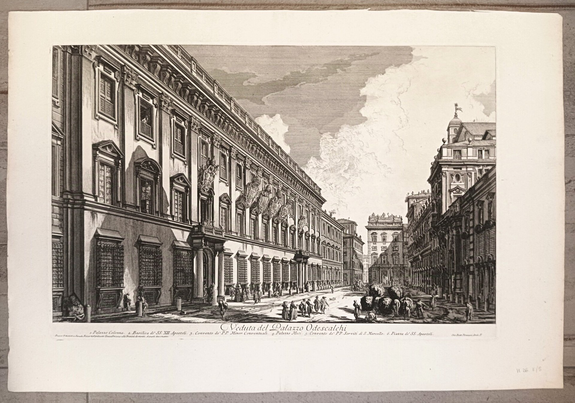 >Acquaforte originale (mm 404x613 e grandi margini), Titolo centrale in basso, subito sotto indicazioni sulla tavola. Firmata in basso a destra"Gio. Batt. Piranesi Arch. F." In basso a sinistra si legge: "Presso l'autore a Strada Felice nel palazzo Tomati vicino alla Trinità de' monti. A paoli due e mezzo". Secondo stato su cinque. Tratta dalla celebre serie di 135 “Vedute di Roma disegnate ed incise da Giambattista Piranesi Architetto Veneziano” (eseguite dal 1748 al 1778), capolavoro dell'incisione di tutti i tempi. Bell'esemplare impresso su carta pesante a grandi margini, traccia di antica piega centrale, filigrana "doppio cerchio e giglio".