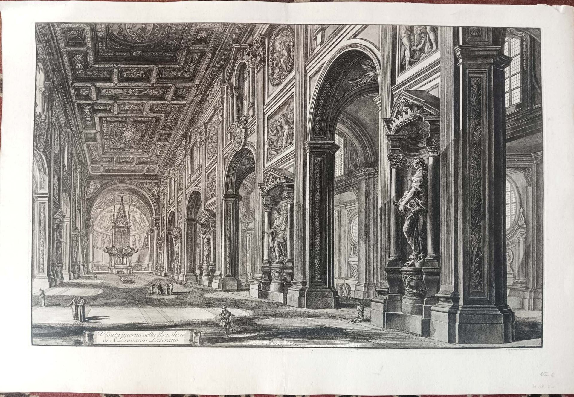 >Acquaforte originale (mm 435x682 e grandi margini). Titolo in basso a sinistra, entro cartiglio. Firmata in basso a destra "Cavaliere Piranesi inc.". Primo stato su cinque. Tratta dalla celebre serie di 135 “Vedute di Roma disegnate ed incise da Giambattista Piranesi Architetto Veneziano” (eseguite dal 1748 al 1778), capolavoro dell'incisione di tutti i tempi. Questa celebre serie di acqueforti, iniziata intorno all'anno 1747, rappresenta l'opera più nota e richiesta della produzione artistica dell'autore. Mediante questo ambizioso progetto iconografico, ampliato nel corso degli anni, l'artista offrì al pubblico un'immagine sistematica e teatralmente suggestiva della Roma barocca con la sua urbanistica trionfale e seppe evocare con straordinaria forza espressiva il mistero e la grandiosità delle rovine dell'antica Roma. Bell'esemplare impresso su carta pesante, vergellata, a grandi margini, traccia di antica piega centrale.