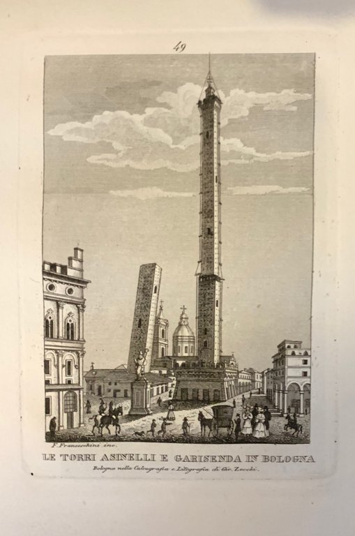 >in-8 oblungo (mm180x245), legatura coeva in mezza pelle, titolo e filetti in oro al dorso, piatti marmorizzati.. L'opera è composta da titolo figurato e 98 vedute delle principali città italiane, tra le quali: Bologna, Como, Venezia, Vicenza, Firenze, Verona, Padova, Terni, Parma, Ancona, Roma, Livorno, Modena, Mantova, Genova, Arezzo, Lucca, Assisi, Messina, Siena, Prato, Pistoja, Torino, Milano, Arezzo, Cremona, Urbino, Napoli, Malta, Palermo, Faenza, Rimini. Mancante delle tavole 67 e 73. La tavola 35 è posposta alla 36. Esemplare a fogli disuguali le seguenti tavole: Duomo e Piazza di Ferrara (tav 31); Castello dei Duchi in Ferrara(tav 40);Piazza del mercato e palazzo della ragione di Ferrara (tav 94); Prigione del Tasso (tav 95);Esterno della casa d'Ariosto in Ferrara (tav 97); Interno della casa d'Ariosto in Ferrara (tav 98) sono in formato più piccolo e non numerate in quanto tratte da altri esemplari.Leggero spotting marginale su alcune tavole. Le incisioni sono opera dei più celebri artisti locali del periodo fra cui Rosaspina, Romagnoli, Franceschini, Zecchi che prendono spunto da opere di Morghen, Magazzari, Pizzoli. Seconda edizione, differisce dalla prima edizione per il frontespizio. A. Brighetti, Bologna nelle sue stampe. Peyrot II, n. 409 per le due tav relative a Torino.Vedute e piante scenografiche dal Quattrocento all'Ottocento, 1979..
