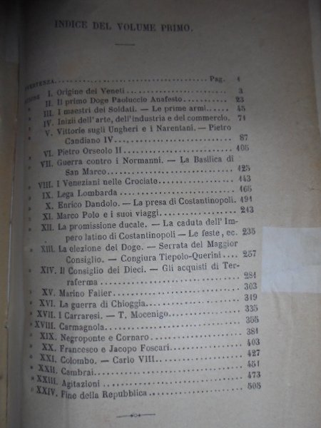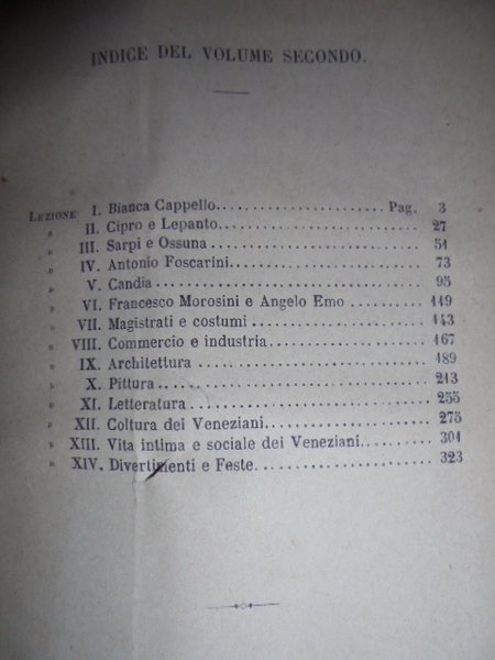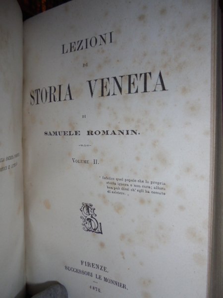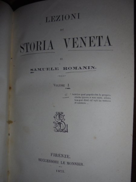 (Veneto) SAMULE, ROMANIN. Firenze, Successori Le Monnier, 1875. Lezioni di Storia Veneta. In-8° antico, tela con titolo in oro entro tassello sul dorso. 2 volumi legati assieme. 533, (1) pp.; 343, (1) pp. Opera in ottime condizioni. Lavoro più breve e divulgativo, ma anche assai più raro, rispetto alla monumentale "Storia documentata di Venezia" in 10 volumi, del grande storico veneziano. Ottimo esemplare. Neg. mob. nero 9