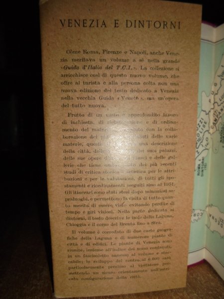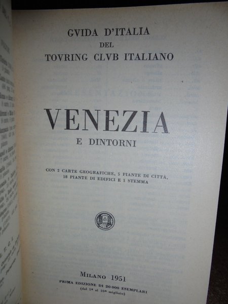 VENEZIA e dintorni. Guida d' Italia - Touring Club Italiano, 1951. In-16° piccolo, tela con titoli in oro e sovracopertina. 399, 11 pp. (piante di Venezia) con 2 carte geografiche, 5 piante di città, 18 piante di edifici e 1 stemma. In ottimo stato di conservazione. Neg. viaggi.