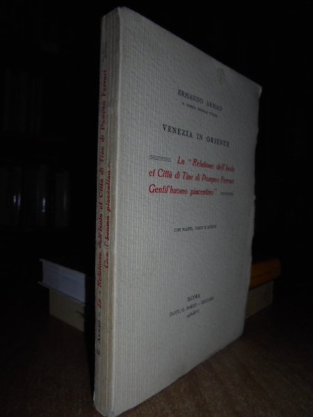 Armao, Ermanno. Roma, G. Bardi, 1938. Venezia in Oriente. La << Relatione dell' Isola et Città di Tine di Pompeo Ferrari gentil' huomo piacentino >>. In-8°, br. con piante, carte e schizzi. Esemplare in ottimo stato di conservazione (intonso). Edizione di sole 600 copie. Neg. mob.5