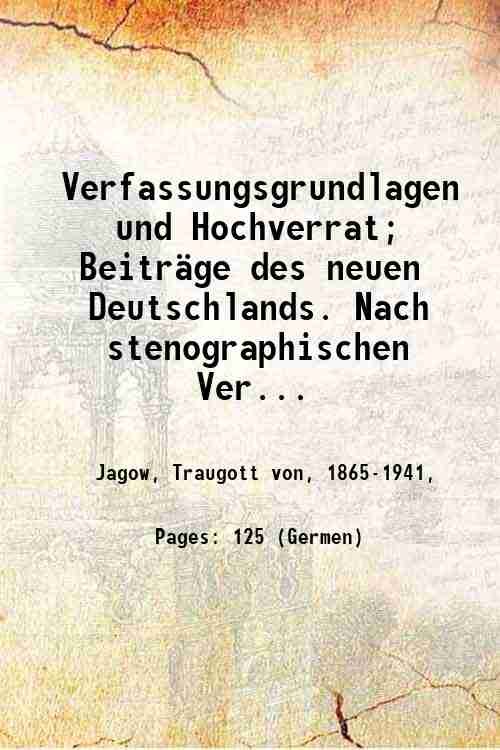 Verfassungsgrundlagen und Hochverrat; Beitr‰ge des neuen Deutschlands. Nach stenographischen Verhandlungsberichten und amtlichen Urkunden des Jagow-Prozesses bearb. von Karl Brammer. 1922