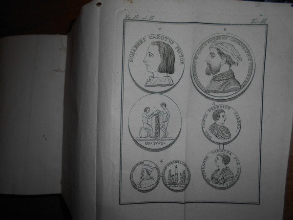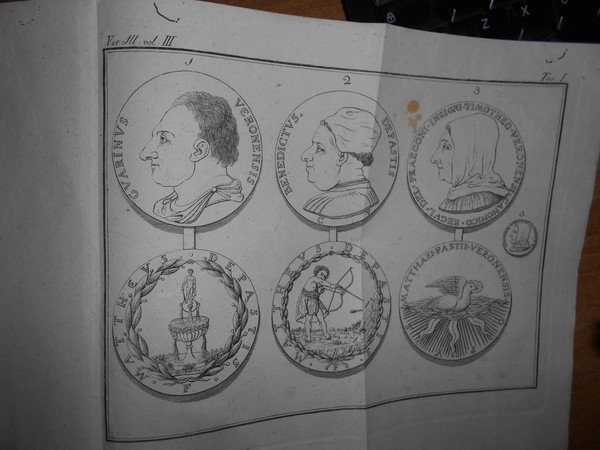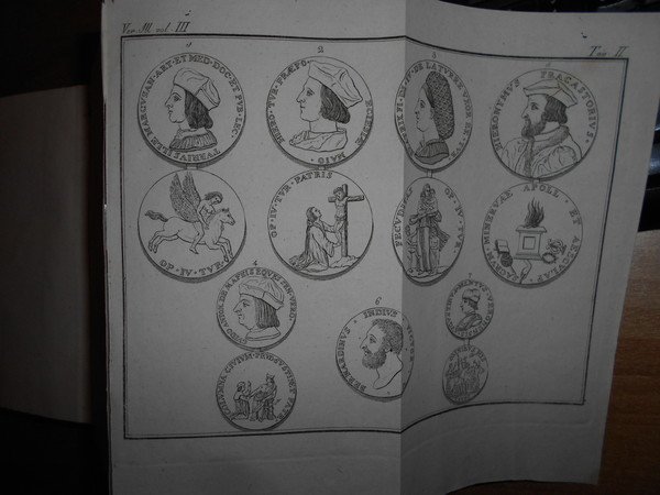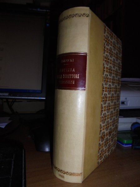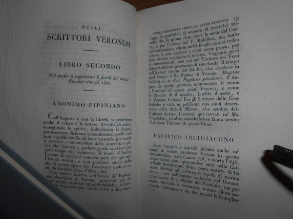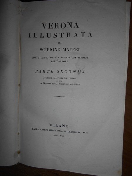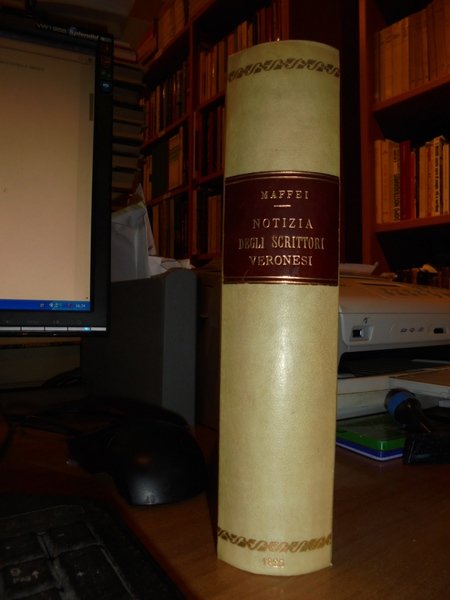 di Scipione Maffei. Milano, dalla Società Tipografica de' Classici Italiani, 1825. Notizia degli Scrittori Veronesi. Libro primo - Libro quinto. In-8° piccolo, m. pergamena con fregi e titolo in oro entro tassello al dorso. 490, (1) pp. con in fine 3 tavole incise più volte ripiegate raffiguranti noti scrittori veronesi. Piccoli forellini in alcune pagine nel margine interno bianco vicino al dorso. Uff. A - I - 2