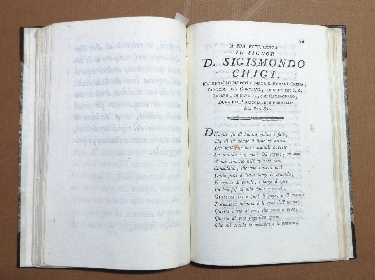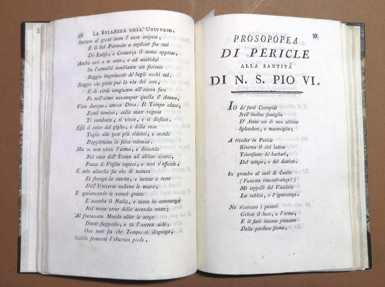 >2 parti in 1 vol. in-8, pp. (10), 63; 80. Legatura ottocentesca in m. pelle e angoli, titolo e filetti in oro al dorso. Edizione originale della seconda raccolta di componimenti poetici (sacri nella prima parte, profani nella seconda), alcuni dei quali tra i più importanti e significativi del primo periodo creativo del Monti. Compaiono qui per la prima volta: "Il Pellegrino apostolico", canto in terza rima del 1782, scritto per salutare la partenza di Pio VI per Vienna e il suo ritorno; "La Prosopopea di Pericle", ode in settenari per celebrare la guarigione di Pio VI dalla grave malattia che lo aveva colpito nel 1779; e "A sua Ecc.za Don Sigismondo Chigi", sono i famosi versi "Sciolti" propriamente detti, ed i "Pensieri d'amore": gli uni e gli altri scritti per sfogare il disperato amore per Carlotta Stewart. Sono tra i versi più schietti e limpidi che il Monti abbia scritto, ispirati al Werther di Goethe ed anticipatori dei motivi dell'Ortis di Foscolo. In ottimo stato, lievemente rifilato. Bustico, 2-3.