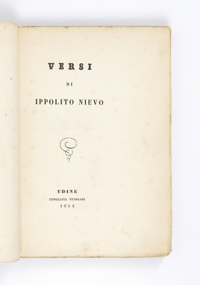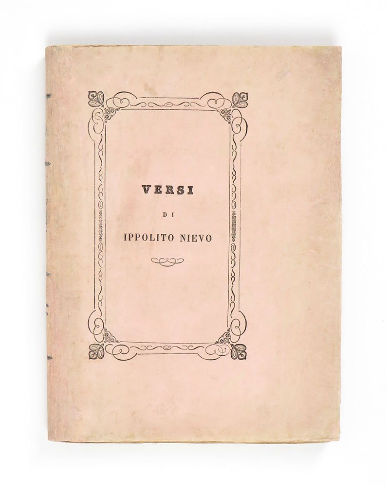 LIBROEdizione originale.Straordinario esemplare a pieni margini (214 x 157 mm), per gran parte intonso, nella rarissima brossura originale (restauro professionale molto ben riuscito).Prima raccolta poetica di Ippolito Nievo, rarissima, tirata in soli cento esemplari. «Sono ventitré pezzi; un vero mosaico che si unifica però bellamente nello scopo d’una restaurazione civile e morale. Dio voglia che i lettori capiscano!» (lettera di Nievo ad Attilio Magri, 2 maggio 1854). Già da questa prova giovanile emergono con tutta chiarezza la verve polemica e l’impegno civile e politico del poeta, che culmineranno con la sua opera maggiore, le «Confessioni»: «Fin dagli inizi […] la sua attività di scrittore in versi è, più spesso che poesia, una poetica; […] una poetica mai smentita né alterata nella sua essenza, perché le ragioni di poesia e le ragionio di vita sono, per il Nievo, tutt’uno. E proprio per questo intento pratico, civile, come si diceva allora (e spesso voleva dire anche “politico”), le poesie del Nievo, specialmente quelle della prima raccolta udinese, […], non di rado sono giornalismo in versi» (Nievo, Poesie, ed. Gorra, p. XXXIII). Nei «Versi» furono stampate le ventitre poesie apparse su «L’Alchimista friulano» tra il novembre 1853 e il maggio 1854. La rivista era diretta da Camillo Giussani, brillante e precoce giornalista, pressoché coetaneo di Nievo, che ebbe un ruolo fondamentale nella pubblicazione. Fu a lui che venne l’idea, già nel dicembre 1854, di raccogliere in un volumetto i componimenti che uscivano sulla rivista. In una lettera del 4 dicembre inviata a Nievo, dopo aver lodato le qualità del poeta, «uno di quei pochi caratteri onorevoli, in cui l’intelligenza è in armonia col cuore», osservava che «i suoi versi meriterebbero di apparir in una veste più degna che non sulle pagine di un giornale», offrendosi infine di pubblicarli in volume (le citazioni in Nievo, Poesie, ed. Gorra, pp. 890-1). Nievo accettò di buon grado l’offerta di Giussani e il lavoro procedette secondo uno schema assai efficace: «Man mano che uscivano [in rivista, le poesie], se ne utilizzava nella tipografia Vendrame – la stessa che stampava il giornale – la “composizione” per il volume» (Nievo, Poesie, ed. Gorra, p. 899). Così facendo, il libro dei «Versi» risultava già pronto per essere presentato alla censura nel maggio 1854. E anche questo delicato passaggio si svolse senza intoppi: fin dai tempi della pubblicazione in rivista, Nievo aveva infatti lasciato carta bianca a Giussani di intervenire sulle sue poesie, e il direttore, mosso da ragioni prudenziali, non si era fatto alcuno scrupolo a modificare i testi, arrivando anche a cassare interi versi. Come accennato, l’edizione risulta oggi molto rara (se ne contano 10 esemplari nel catalogo SBN), tanto più nella sua brossura originale. Data la tiratura bassissima, il volume divenne presto introvabile anche ai tempi del poeta: quando un suo compagno di studi gliene chiese una copia, Nievo rispose con parole eloquenti: «de’ primi versi satirici non ho più in casa nemmeno l’odore» (Nievo, Poesie, ed. Gorra, p. 891-2).Nievo: Poesie, a cura di Marcella Gorra (Milano, Mondadori, 1970)