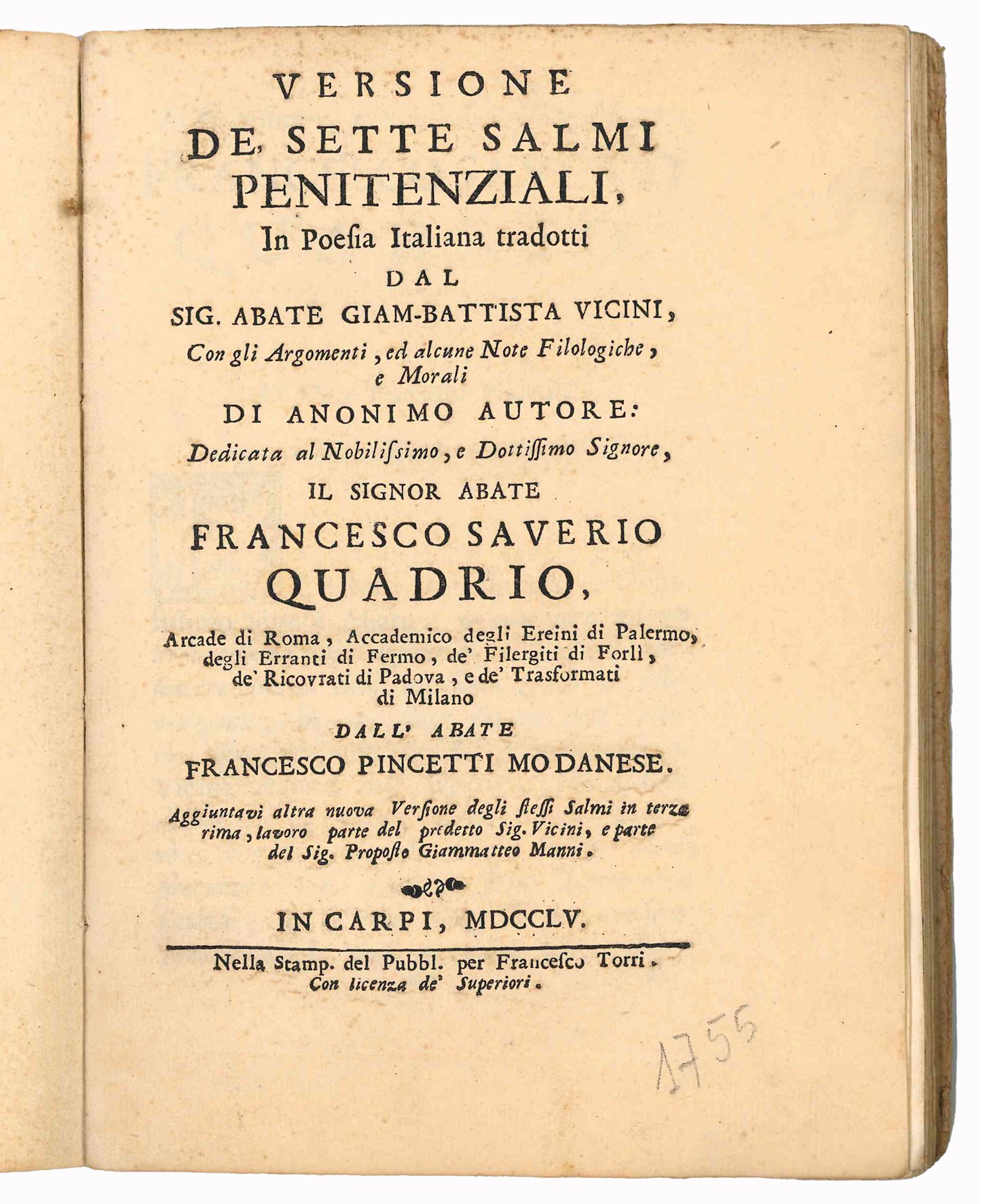 Versione de Sette salmi Penitenziali. In Poesia Italiana tradotti [...] Con gli Argomenti, ed alcune Note Filologiche, e Morali [...]