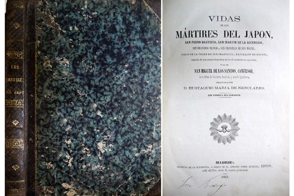 Madrid, Imprenta de la Esperanza, a cargo de Don Antonio Pérez Dubrull, Editor, 1862. 4to. mayor; 264 pp., 4 hs., con cinco láminas (de 6) litografiadas por C. Escarpizo, una de ellas doble y en color que representa la crucifixión de los mártires en Nagasaki. Encuadernación en media piel, de la época, fatigada.