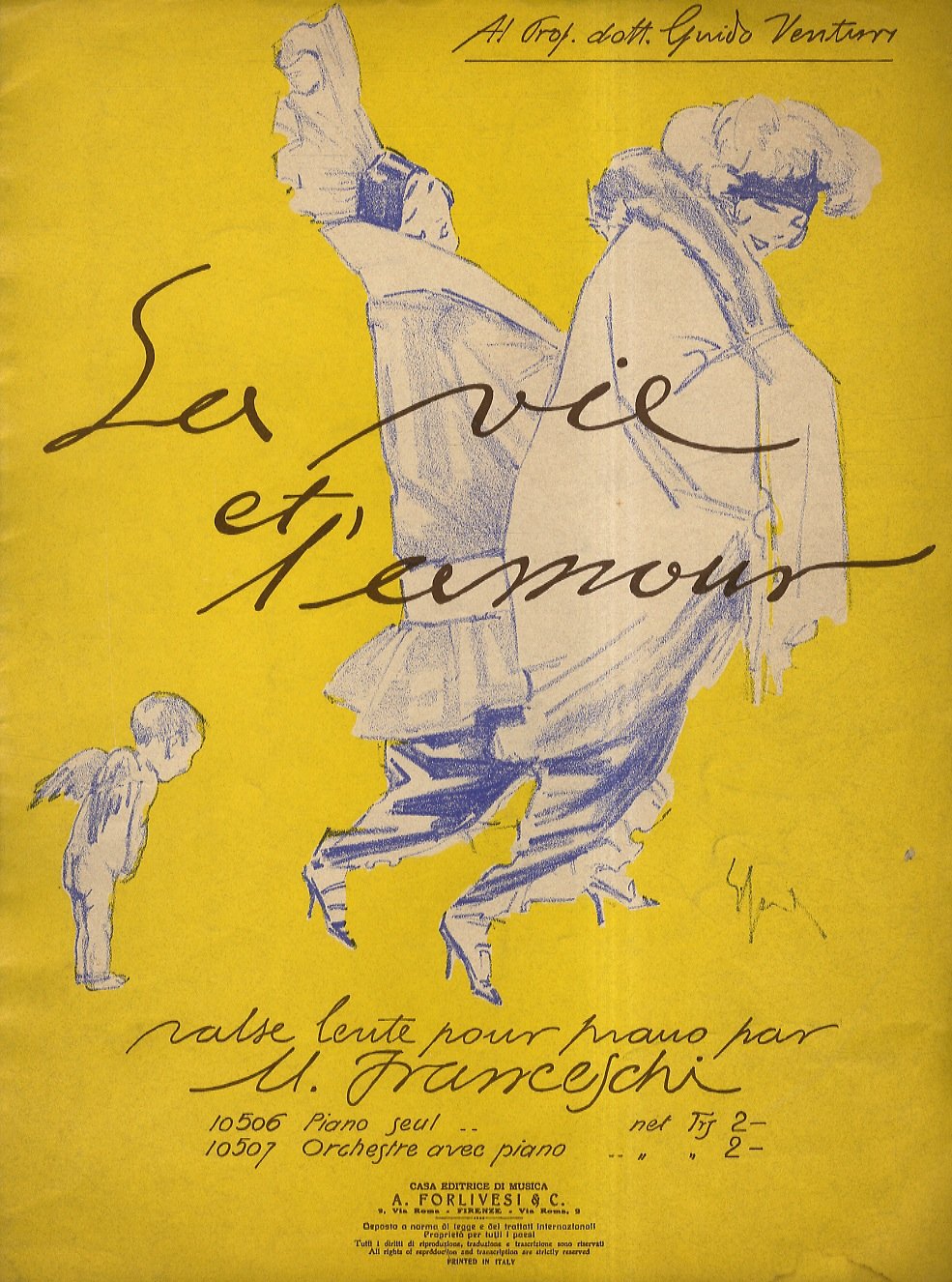 Firenze, Casa editrice di musica A. Forlivesi & C., [primi del '900], in-4, br. edit. con una bella illustrazione in litografia di Enrico Sacchetti sulla copertina anteriore, pp. [4] di musica notata. Un invio datato 1918 sulla prima pagina bianca.
