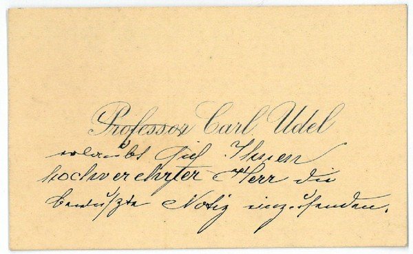 1 S. Visitkartenformat. Anfangs als Violinist und Cellist u. a. am Theater a. d. Wien, am Carltheater und am Josefstädtertheater tätig, kam Udel 1871 zum "Komischen Quartett" des Wiener Männergesangsvereins. "Dieses komische, nicht nur in Wien, auch im Auslande bekannte und beliebte Quartett ist nach einem Personenwechsel der übrigen drei Stimmen am 3. März 1880 zum ersten Male als ‘Quartett Udel’ vor das Publicum" getreten (Eisenberg, Das geistige Wien, zit. n. DBA I 1292, 120) und fand in Folge große Anerkennung, wurde gar "wiederholt in allerh[öchste] Kreise gezogen" (ebd.). Udel selbst war seit 1877 Professor am Wiener Konservatorium, wo er u.a. Eduard Rosé und Franz Schmidt im Violoncellospiel unterrichtete. Vgl. MGG XI, 906 (Rosé) und 1853 (Schmidt). Seine Stellung im Hofopernorchester hatte Udel später eines Handleidens wegen aufgeben müssen, und 1904 war er erblindet.