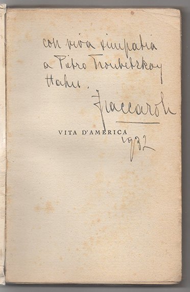 LIBROSeconda edizione.CON AUTOGRAFO.Bell’esemplare con dedica autografo all'occhietto: «Con viva simpatia a Pietro Troubetzkoy Hahn… 1932»; leggere macchie in copertina e tracce d'uso al dorso.Prose di viaggio, la cui prima edizione risale al 1928, frutto della lunga permanenza negli U.S.A. come inviato del «Corriere della Sera».