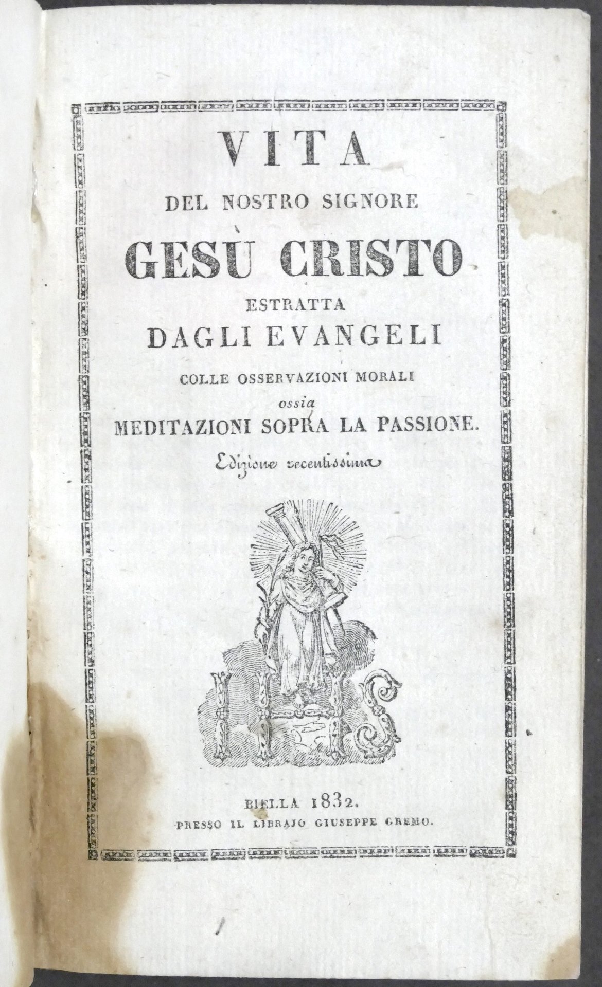 Vita del Nostro Signore Gesù Cristo estratta dagli Evangeli colle osservazioni morali, ossia Meditazioni sopra la Passione Biella, presso il librajo Giuseppe Gremo, 1832Pag. 468 Copertina rigida non coeva - Lingua italiana. Condizioni buone. Legatura e sguardie rifatte. Macchia alla parte inferiore centrale delle pagine.