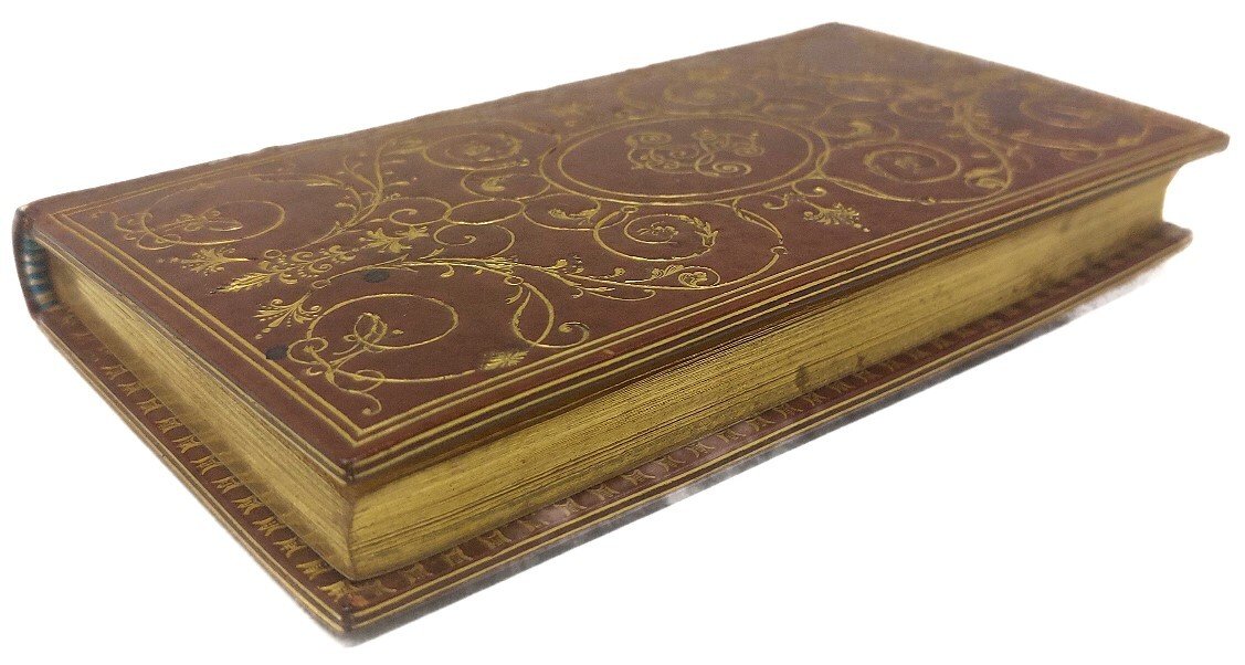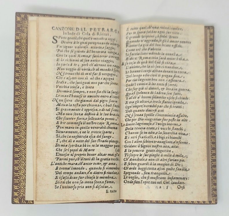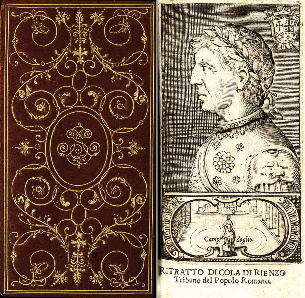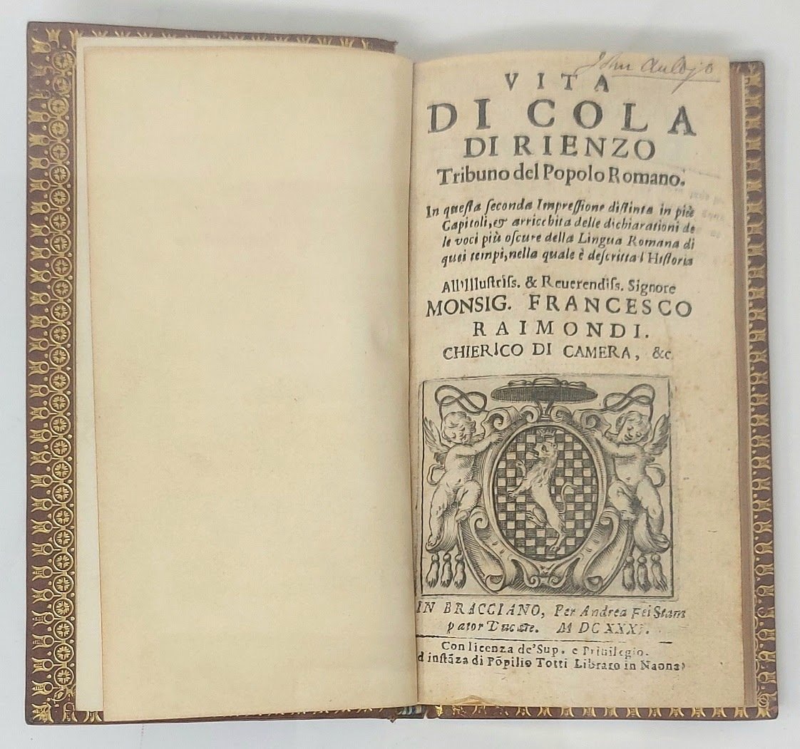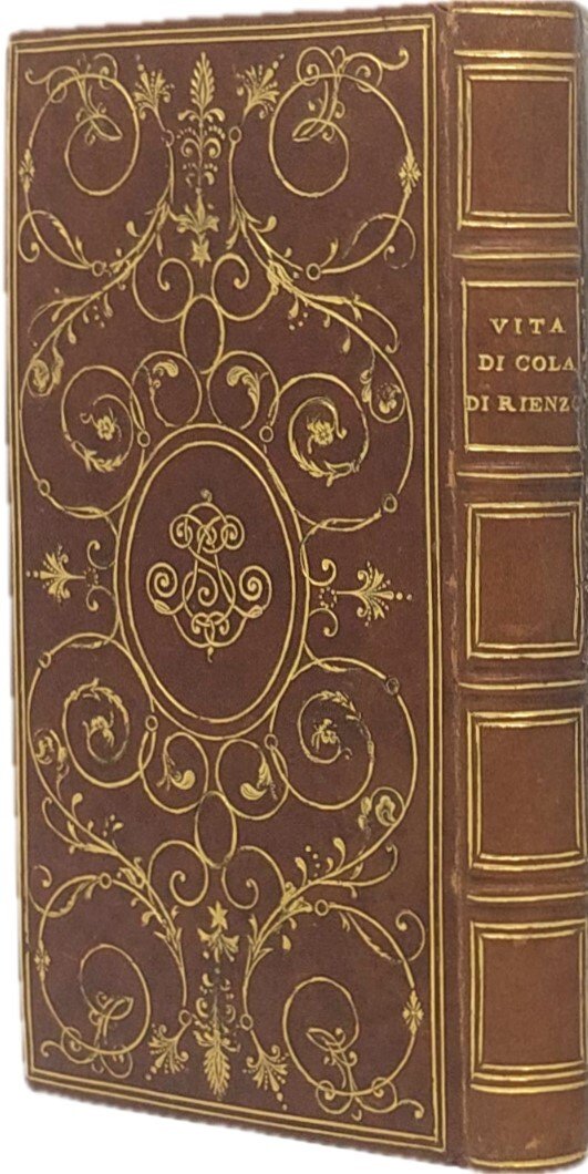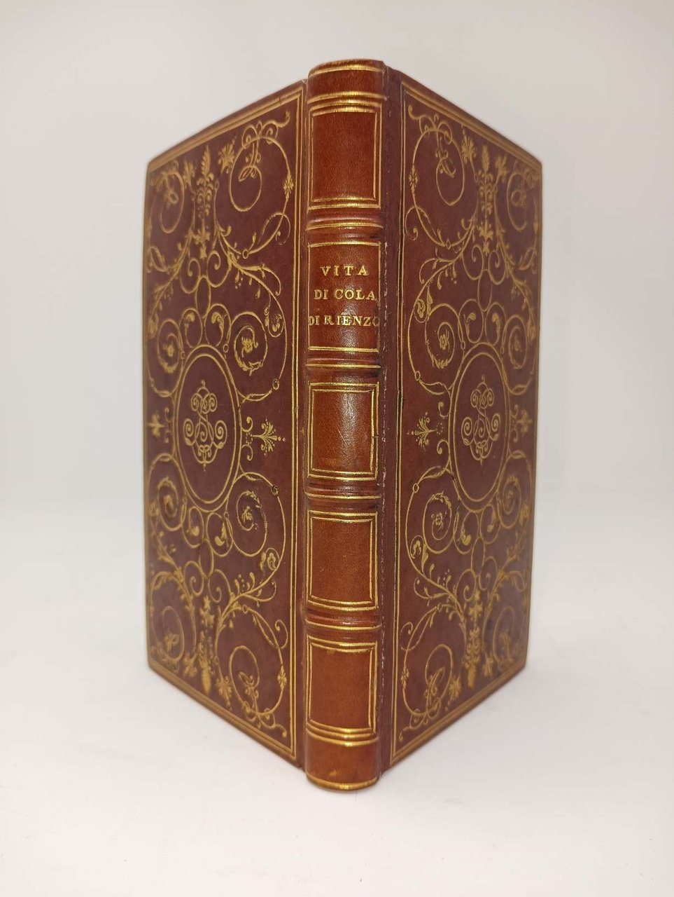>in-12 (135x70 mm), pp. (24), 226, (2, bianche), stemma del dedicatario inciso sul frontespizio, due bei ritratti di Cola di Rienzo incisi in rame a piena pag. nei fogli preliminari. Artistica legatura 800sca in pieno marocchino nocciola, ricca decorazione oro a fiori e volute sui piatti, dorso a nervi con titolo e filetti oro, tagli dor., dent. int. Seconda edizione (la prima di Bracciano, Fei, 1624, ''scritta in lingua volgare romana da Tomao Fiordifiocca''). Rara biografia storica di Cola di Rienzo, scritta in curioso dialetto romanesco, impressa dal prototipografo di Bracciano durante uno dei primi anni di attività della sua stamperia nella città laziale. E' dedicata a Monsignor Francesco Raimondi ed include la Canzone del Petrarca in lode di Cola di Rienzi. Ottimo esemplare in legatura d'amatore, firma di possesso ms. al frontespizio e note al verso dell'ultima bianca. Cat. Vinciana n.648. Olschki, Choix, n.17941. Fumagalli, Lexicon Typ. It., p.50.