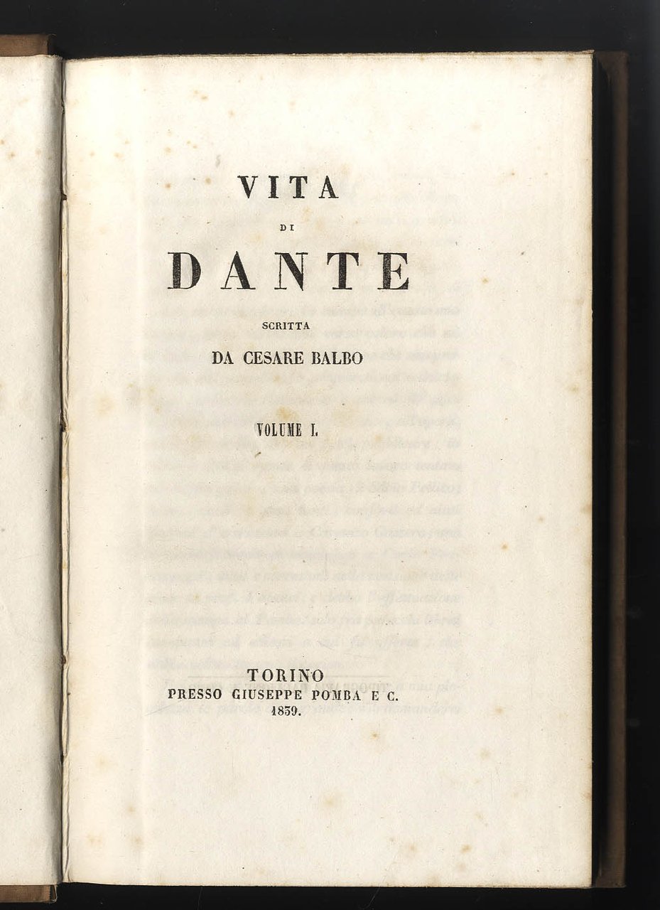 >2 volumi in-8, pp. 368, (4); 492; Legatura coeva in tutta percallina, tit. e filetti oro ai dorsi (un lieve difetto sui piatti). Prima edizione di opera assai importante, che, pur con alcune inesattezze storiche, "resta indice di un profondo sentimento patrio e di un'acuta interpretazione dell'anima italiana del Poeta" (Renda-Operti, p. 89). Buon esemplare (qualche lieve fioritura della carta). Parenti, Rarità IV, pp. 38-40. Parenti, Prime ediz., p. 47. Biancardi-Francese p. 38.