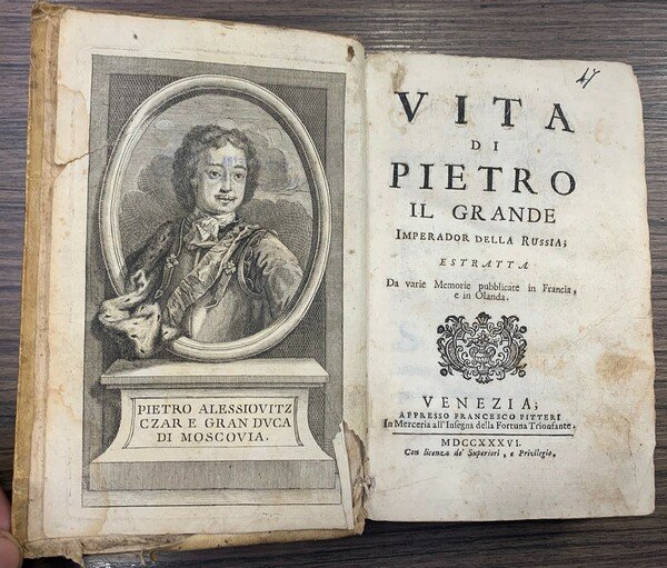 Imperador della Russia. Estratta da varie Memorie pubblicate in Francia, e in Olanda. Venezia. Pitteri 1736, 16°, pp. 384, con una incisione in antiporta con mancanze. Bruniture e segni del tempo. Leg. Piena pergamena coeva con bruniture e piccole mancanze.