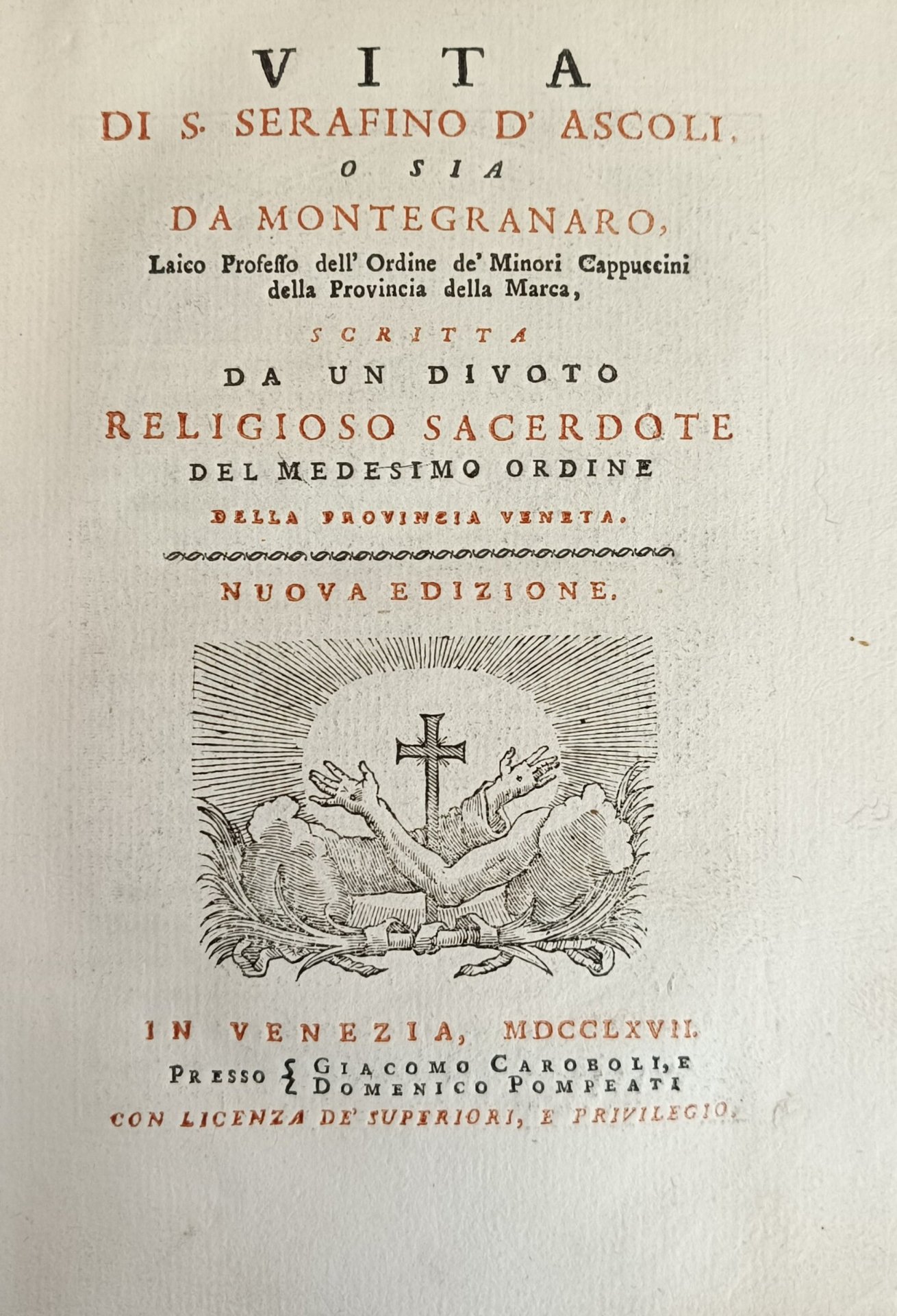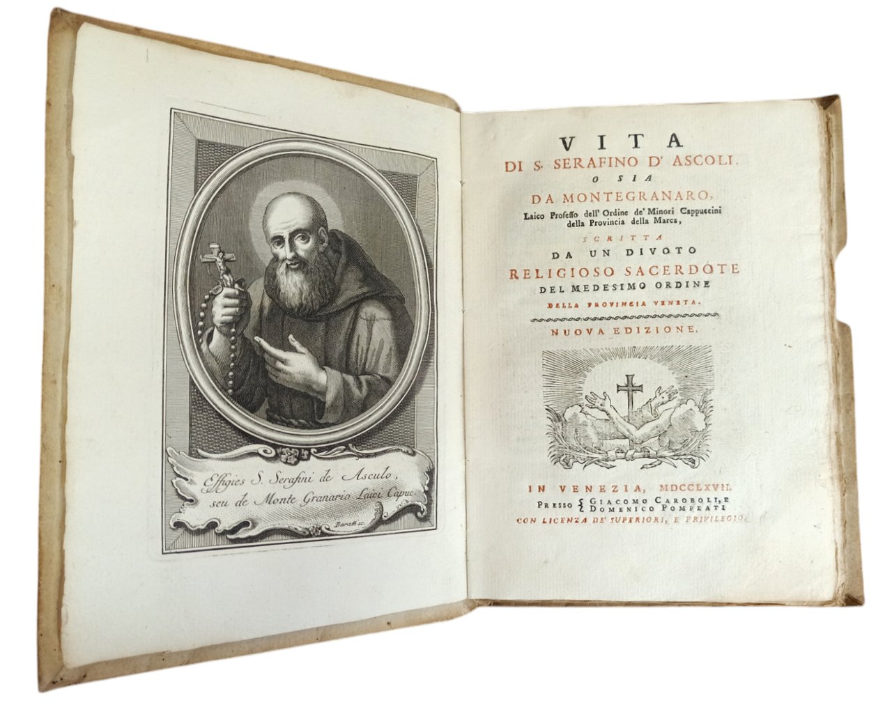 Non comune opera agiografica che narra la vita di San Serafino da Montegranaro, frate cappuccino del XVI secolo noto per la sua umiltà e devozione. Edizione originale. acquaforte f.t. al frontespizio dedicata a "S. Serafini de Asculo" e incisa dal Baratti, marca tipigrafica al frontespizio, capilettera decorati e testatina decorata. in quarto leg. cart., scritta manoscritta al dorso pp. (XII), 188, (1 c.b.) Buono (Good) Buon es., antica abrasione al piatto post..