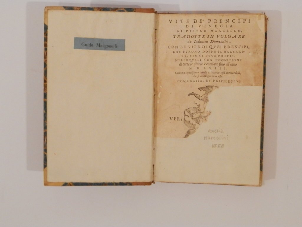 Vite de' prencipi di Vinegia di Pietro Marcello, tradotte in volgare da Lodovico Domenichi. Con le vite di quei prencipi, che furono doppo il Barbarigo, fino al doge Priuli. Nelle quali s'ha cognitione di tutte le istorie venetiane fino all'anno 1558. Con una copiosissima tavola di tutte le cose memorabili, che si contengono in esse.