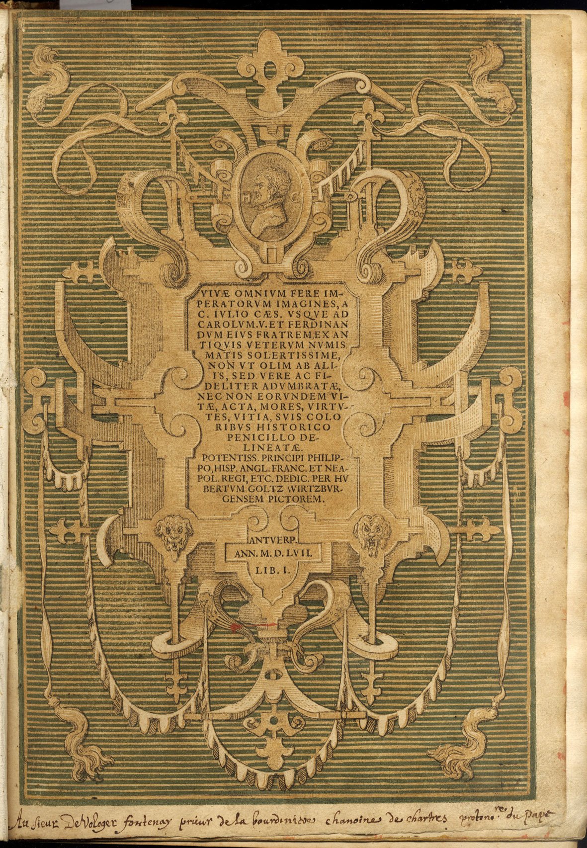 >in-folio (330x240 mm), ff. 182 (su 184): frontespizio figurato in chiaroscuro, 18 di introduzione e indici, 157 su 159, 6 (l'ultimo bianco, applicato al contropiatto). Mancano i ff. T1 (con ritratti affiancati di Irene e Costantino) e V6 (Ottone II). La numerazione dei ritratti è da I a CLV, per complessivi 150 ritratti essendo alcuni affiancati; dopo il ritratto 140 vi sono 3 ff. di testo relativi a Enrico II, mentre dopo il 141 un foglio a stampa con la genealogia di Rodolfo II. Tra i 6 ff. finali un ovale raffigura la concordia di Filippo e Massimiliano. Legatura del XVII secolo in mezza pelle ed angoli, tassello con titolo oro al dorso, carta salmone ai piatti. Edizione originale. Titolo entro elaborata struttura architettonica sormontata dal ritratto dell'a. entro ovale, il tutto su fondo a righe verdi e 151 medaglioni, di cui 13 rimasti vuoti in quanto non completati. Si tratta dunque di 151 silografie in chiaroscuro in ocra lumeggiate in biacca: 139 comprendono i ritratti degli imperatori romani e tedeschi da Giulio Cesare a Ferdinando III. Queste raffinatissime incisioni realizzate a chiaroscuro furono eseguite da Josse Gietleughen con una tecnica che unisce l'impressione di un legno realizzato al tratto e di uno assimilabile al mezzotinto. L'incisore Hubert Goltz (Wurtzburg 1526 - Bruges 1583) si guadagnò inoltre la fama di essere il primo numismatico del suo tempo dando alle stampe questo volume, indiscusso punto di riferimento sino alla metà del XVIII secolo. Esemplare ben conservato, malgrado qualche brunitura o fioritura, di opera di grande impatto grafico; al titolo nota di possesso ms. Vologer Fontenay (chanoine de N.Dame de Chartre, autore di un «Voyage faict en Italie par le marquis de Fontenay-Mareuil» edito nel 1643; altra nota d'acquisto secentesca alla fine della prefazione. Da segnalare che tutte le bibliografie indicano una paginazione varaiabile ed un numero di ritratti inferiore al nostro esemplare. Hollstein, Dutch, VIII, p. 139. Cicognara, 2868: ''è fra le opere di Golzio da tenersi di maggior pregio d'ogni altra''. Brunet II 1653. Berlin Katalog, 4240. Adams G-838