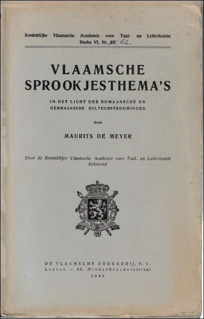 Oorspronkelijk uitgevers omslag, 191paginas, 1 uitvouwbare plaat, 25.5 x 16.5 cm, goede staat. Vlaamsche sprookjesthema's in het licht der romaansche en germaansche kultuurstroomingen