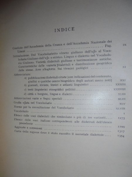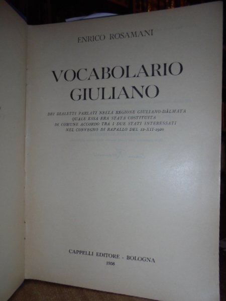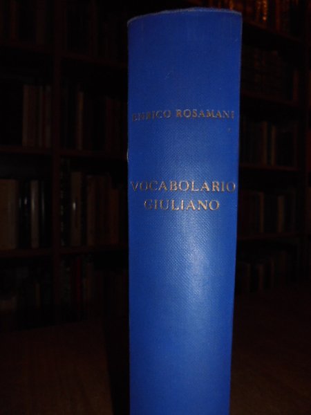 Enrico, Rosamani. Bologna, Cappelli editore, 1958. Vocabolario Giuliano dei dialetti parlati nella regione Giuliano-Dàlmata quale essa era stata costituita di comune accordo tra i due stati interessati nel convegno di Rapallo del 12-XII-1920. In-8° grande, tela edit. con titoli in oro sul piano e al dorso. Testo stampato su due colonne. xlvii, 1354 pp. con una tavola ft. più volte ripiegata raffigurante la carta della regione dove è stato raccolto il materiale linguistico per ilo vocabolario. In ottimo stato di conservazione. Neg. Mob. 4.