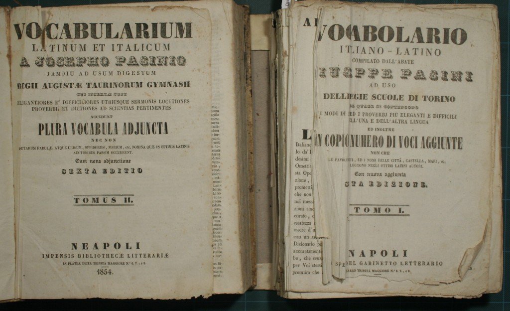 Ad uso delle Regie scuole di Torino. Nel quale si contengono i modi di dire ed i proverbj più eleganti e difficili dell'una e dell'altra lingua - Ed inoltre un copioso numero di voci aggiunte non che le favole de' poeti, ed i nomi delle città, castella, mari, ec. che si leggono negli ottimi latini autori. Con nuova aggiunta. Sesta edizione - in 8° - pp.XIV + 610; XII + 567 - Pergamena - Due volumi - Testo su tre colonne - Legatura e alcune pagine staccate al primo volume, strappo senza mancanze al frontespizio del secondo volume. Frontespizio del primo volume in pessimo stato di conservazione - esemplare da studio