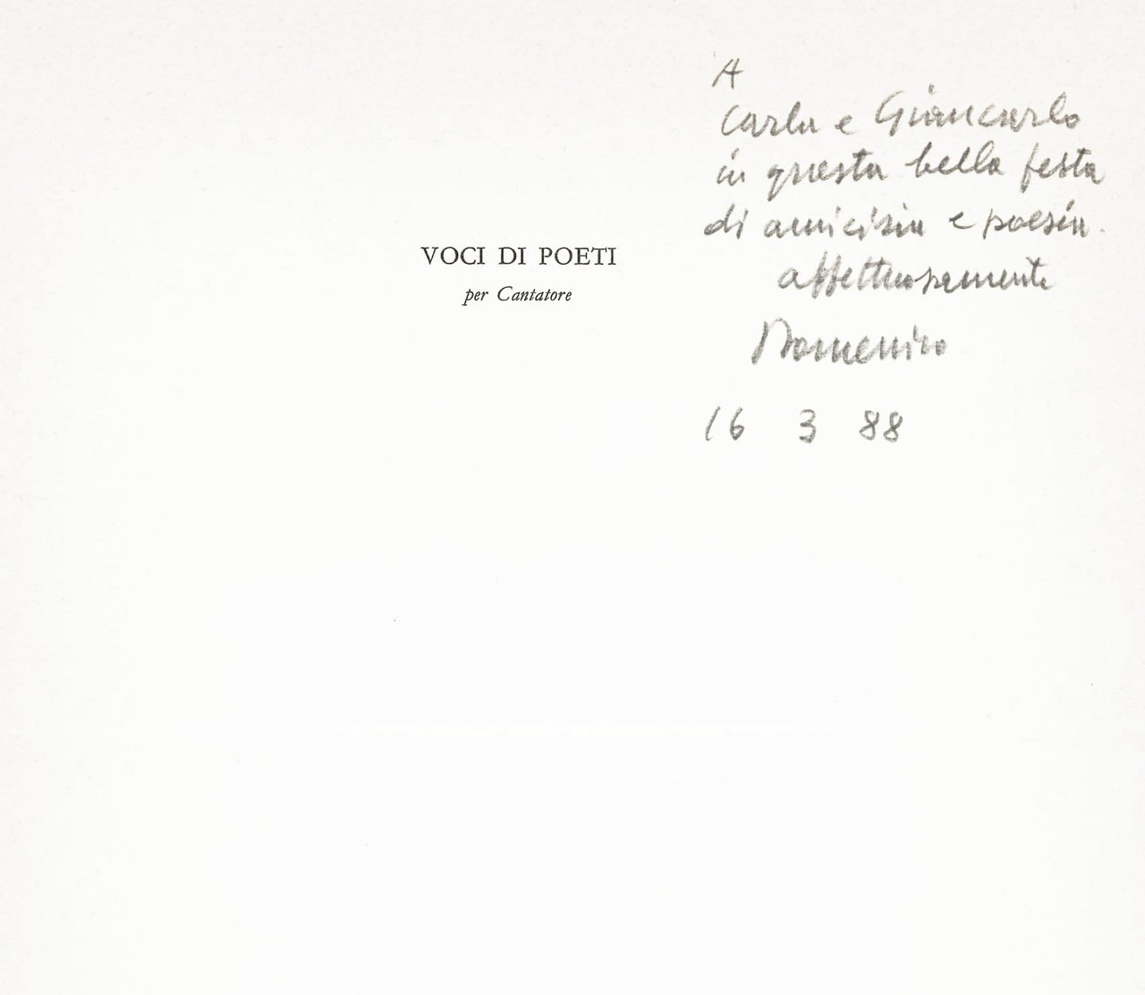 LIBROPrima edizione, tiratura di testa.CON AUTOGRAFO.Esemplare n. 18/150 ben completo della tavola originale incisa da Domenico Cantatore; pregiato dalla dedica autografa dell’artista «A Carla e Giancarlo [Vigorelli] questa bella festa di amicizia e poesia affettuosamente | Domenico | 16 3 88».Edizione fuori commercio di 180 esemplari, di cui 150 numerati da 1 a 150 e 30 numerati da I a XXX con la tavola originale e ottocento senza l’incisione, realizzata in occasione del compleanno di Domenico Cantatore, per le cure di Raffaele Bandini e Luigi Cavallo. Pregevole raccolta di poesie di: R. Carrieri, L. De Libero, A. Gatto, S. Grasso, M. Luzi, S. Quasimodo, L. Sinisgalli, D. Valeri, E. Luraghi, L. De Libero, e altri.