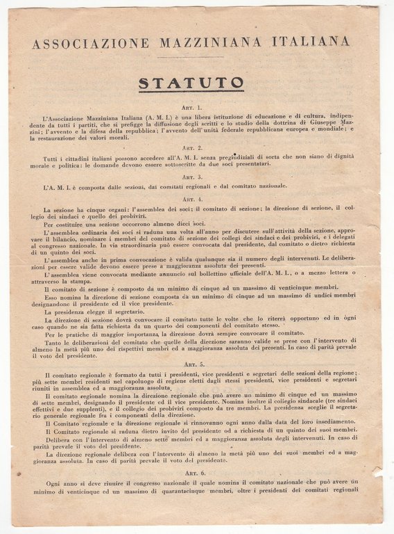 Volantino Dell'associazione Mazziniana Italiana Statuto senza data