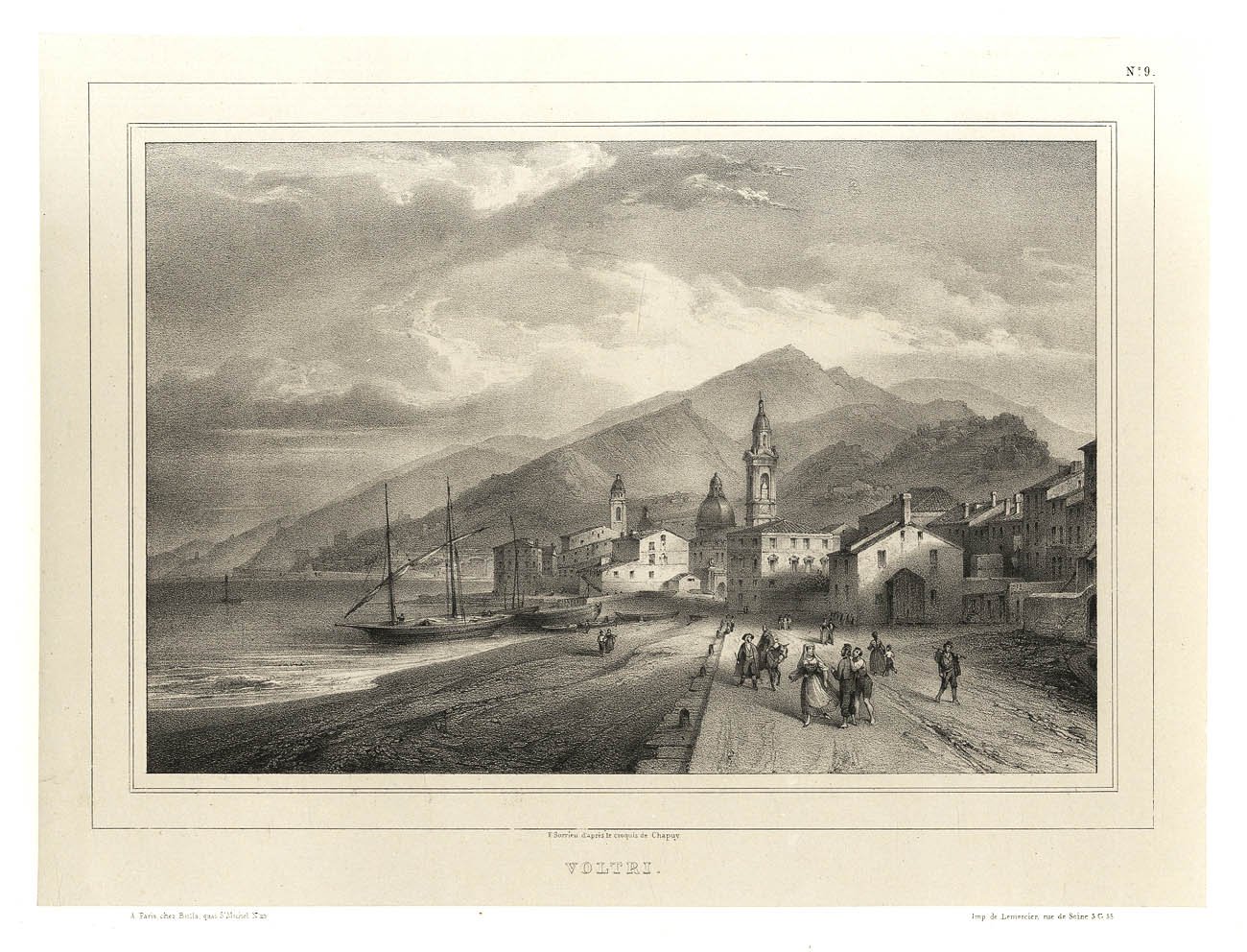 >Litografia (cm. 30x43) eseguita da A. Cuvillier su disegno di Nicolas Chapuy, tratta dalla raccolta: Promenade de Nice à Gênes dessinée d'après nature par Chapuy et lithographiées par Cuvillier, Deroy, J.C. Joly, Monthelier, Tirpenne. Paris, Bulla, Sans année (ma 1837). Esemplare ben conservato
