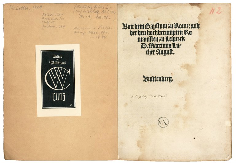First edition (it was reprinted eleven times in the year 1520) of this important pamphlet, in which Luther fiercely responded to the work on papal primacy of the Leipzig theologian Augustin von Alveldt (1485-1530).