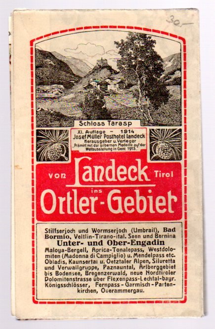 Pieghevole 10x16 cm chiuso, 48x63 cm aperto. Condizioni : USATO - Stato : Buono, ordinari segni d'uso e del tempo. Altre note : All'interno grandissima carta a colori del gruppo dell'Ortles e adiacenze. In testa, sotto ai titoli, immagini in cromolitografia secondo piacevoli disegni di: Solda, l'Hotel Posta a Landeck, il castello di Landeck, Trafoi, Ferdinandshöhe, il gruppo dell'Ortler. Bello e non comune.