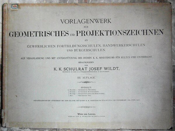 Witwe, 1910. In - folio, cartella edit. in mz. tela contenente fascicolo di testo di pp. 6 e 31 tavole in bianco e nero. Manuale per le scuole tecniche e artigianali avanzate con rappresentazioni di modelli di studio di disegno geometrico e proiezioni ortogonali. Testo e tavole in buono stato