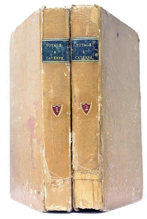 2 tomes en 2 volumes. 1 planche dépliante hors-texte. Xlvii. [48-60]. 312 pages. + 1 planche dépliante hors-texte. 1 feuillet + 404 pages. 4 pages de catalogue de l'éditeur. (21,5x13 Cm). Cartonnage de l'époque. Dos lisse. Tomaisons et titres dorés. Manque de papier aux dos. Charnières fendues. Coins et coiffes émoussés. Plats tachés et frottés. Manque de papier sur le 1er plat du 1er tome. Mouillures. Traces de plis et rousseurs. Édition rare de ce témoignage important sur la déportation et le séjour en Guyane du journaliste et chansonnier contre-révolutionnaire Louis-Ange Pitou. Il fut plus tard gracié par l'empereur. Après avoir brièvement étalé sa vie, l'auteur conte par le menu son arrestation, son emprisonnement et sa déportation à Cayenne. On y trouve de nombreuses anecdotes, sur les Noirs, les Indiens, les anthropophages et la Révolution française. Au debut de chaque tome un frontispices gravé dépliant. Le premier représentant une coupe de la frégate-prison la Décade transportant les déportés, et le second, l'enterrement de déportés au désert de Konanama par des noirs, devant les bagnards en pleurs et les officiers dansants.
