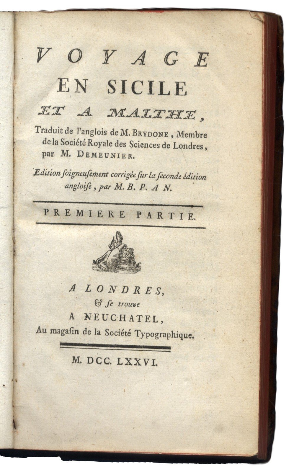 >Due volumi in un tomo, in-8, pp. (2), VIII, 259; (2), 255. Leg. del tempo p. pelle (alquanto consunta), con fregi oro al dorso, tagli rossi. Prima edizione francese di questa relazione di viaggio, scritta in 38 lunghe lettere dal 14 maggio al primo agosto 1770. Le lettere XIV-XVI nel I. vol. riguardano Malta. Narbone I, 96. Mira I, 133. Fossati-Bellani I, 94. D'Ancona 582..
