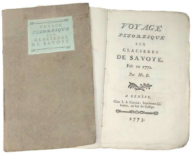in-12 (175x110 mm), pp. 303, (numerosi fogli invertiti nella rilegatura, p. 281 erroneamente num. 181), i fascicoli cuciti ma mai inseriti in alcuna legatura, in una cartone coevo muto, etichetta con titolo a stampa al piatto anteriore, in astuccio moderno in tela blu. Prima edizione. Uno dei primissimi itinerari descrittivi della valle di Chamonix. Opera importante e rara: Bordier fu il primo a spiegare il movimento dei ghiacciai attraverso la spinta gravitazionale delle masse di ghiaccio superiori, fenomeno che fino ad allora veniva negato o ignorato. "This was, therefore, the first enunciation of the plastic theory of glacier movement" (De Beer, Travellers,p. 50 e 519). Politico ginevrino contemporaneo di Bourrit, Bordier (1746-1802) compie l'escursione sui ghiacciai di Chamonix nel 1772, specificando di aver “composé cet ouvrage... pour servir d'itinéraire à quelques amis et pour se rappeler à lui-même un temps passé avec agrément” (cfr. Prefazione). Bourrit, colto di sorpresa da Bordier (che maliziosamente firma l'opera come Mr. B. per lasciare appositamente il dubbio), è così costretto a pubblicare la sua “description des glacières..." in tutta fretta, appena pochi mesi dopo. Bordier sfruttò il successo e la fama di Bourrit, al punto che gli editori della traduzione tedesca arrivarono persino ad attribuire il suo libro all'altro alpinista ginevrino, e ancora oggi quest'opera si trova censita da varie biblioteche come opera del Bourrit. Al di là della mistificazione editoriale, "le livre de Bordier n'a rien d'une imitation, et son style semble même, à dessein, beaucoup moins pompeux, comme si l'auteur, ayant lu Bourrit, avait cherché à en prendre le contre-pied. De plus, cet ouvrage contient deux chapitres remarquables où la théorie des glaciers est envisagée sur la base d'hypothèses nouvelles, très en avance sur leur temps et dont on ne trouve aucune trace dans les publications de Bourrit" (cfr. Yves Ballu, introduzione de "Description des glacières...", 1977). Bell'esemplare, come uscito dallo stampatore, in barbe a margini disuguali, freschissimo eccetto che per una macchia gialla nel margine di 6 fogli.