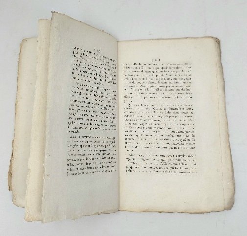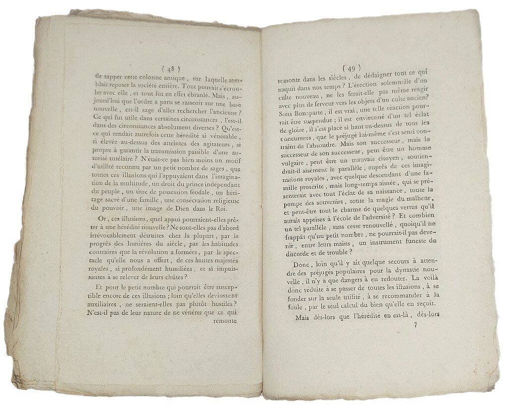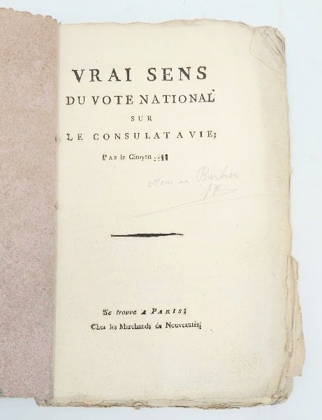 >in-8 (215x135 mm), pp. 60, brossura in carta d'attesa coeva. Seconda edizione, poiché l'Avis de l'editeur dichiara in fine: "La première édition de cet écrit ayant été saisie et l'éditeur arrêtè, par une erreur de la police, on dit que l'auteur s'est fait connaître et a reclamé son ouvrage. On assure que c'est Camille Jordan, de Lyon ex-législateur" (cfr. p 60). Raro pamphlet politico relativo al periodo della storia francese noto come Consulat (1799 - 1804), ed in particolare riguardo la proclamazione di console a vita del Primo Console Napoleone Bonaparte, nel 1802, con il plauso dell'Autore, che fu Deputato della regione del Rhône e membro dell'assemblea Consiglio dei Cinquecento. Buon esemplare, in barbe.