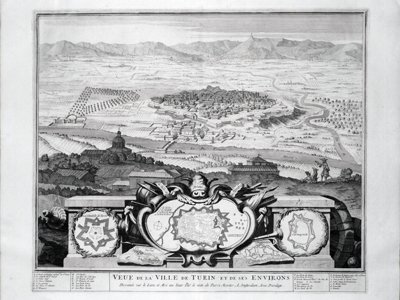 >Incisione originale su rame (mm. 430x505). Bella e rara veduta prospettica della città di Torino e dei dintorni vista dalla collina. Importante e grande cartiglio posto alla base della veduta, con al centro la pianta della città Vercelli, a destra le piante di Carmagnola e Montmelian, a sinistra la cittadella di Torino e Verrua. Titolo al centro del margine inferiore, ai due estremi legenda con 27 richiami.