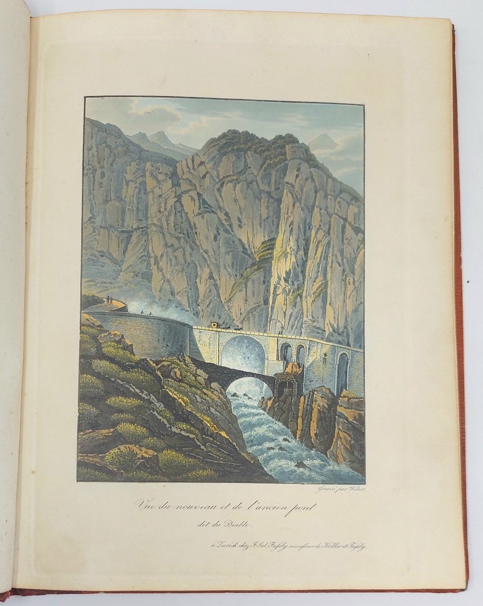 >in-4 (mm 250x188), 15 splendide acquetinte a colori, rialzate à la gomme, ben rileato con dorsoin marocchino rosso, titolo in oro al piatto anteriore. Vedute di San Gottardo, del Ghiacciaio del Rodano, di Grimsel, Oberhasli, Rosenlaui, Wetterhorn, Grindewald, Jungfrau, Lauterbrunen...Otto delle quindici tavole sono state realizzate da Samuel Birman e pubblicate in "Basle, chez Birman et fils". L'artista è noto soprattutto per l'album ''Souvenirs de la Vallée de Chamonix'', pubblicato nel 1826. Cinque tavole sono state impresse a Zurigo. In fine, una rara veduta di Fribourg, disegnata da Winterlin ed incisa da Vogel. Buon esemplare, con vivida colorazione.
