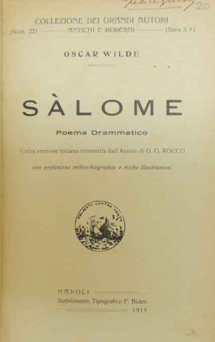 Oscar Wilde, Sàlome. Poema drammatico, unica versione italiana consentita dall’Autore di G. G. Rocco, con prefazione critico-biografica e ricche illustrazioni, Stabilimento Tipografico F. Bideri, Napoli 1915, pp. XVI, 96, 6 c. di tavv. f.t. ill. b.n., cm 19, legatura in mezza tela muta con titolo manoscritto al dorso. Collezione dei grandi autori antichi e moderni. Serie terza, n. 22. Segnatura di collocazione alla prima carta, firma d’appartenenza e data all’occhiello e al frontespizio. Lievissime tracce d’uso alla legatura, minime fioriture, qualche segnetto di lapis, per il resto ben conservato.